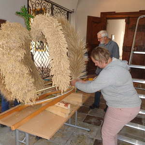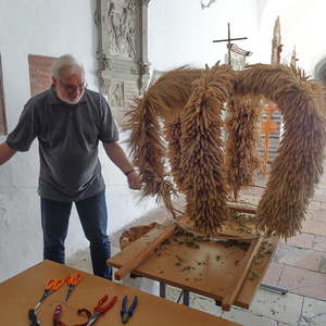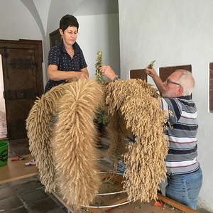 Bereits im Frühsommer haben PGR-Mitglieder unreife Ähren geschnitten und damit diese die grüne Farbe beibehalten, trocken und dunkel gelagert. Die reifen Ähren wurden aus Restbeständen von der Zuchtstation Reichersberg zur Verfügung gestellt. Unter fachkundiger Führung von Regine Windsberger (www.blumen-bluetenzauber.at) wurde schließlich am 18. September unsere Erntekrone wieder in einen herzeigbaren Zustand versetzt.