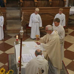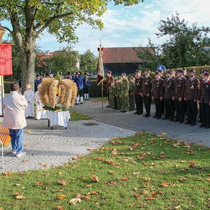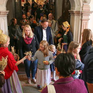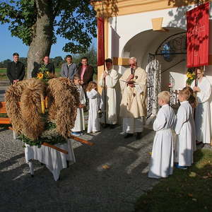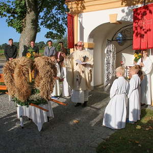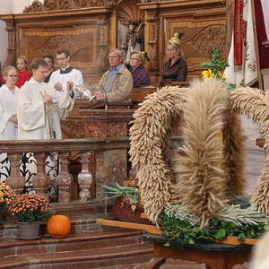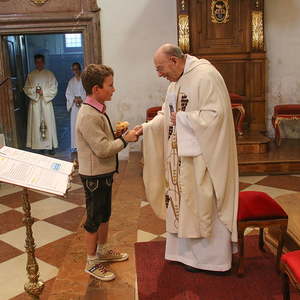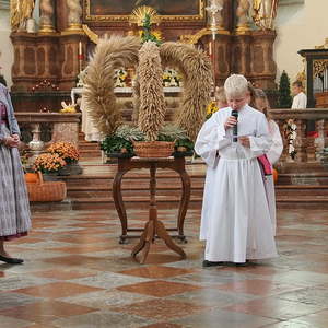 Nachdem die Kinder noch Fürbitten und Gedanken zu den Erntegaben vorgetragen hatten, wurden noch die Michaeliknöpfe gesegnet und am Ende des Hochfestes an die Schulkinder verteilt. Damit wird der Segen auch in die Familien getragen.