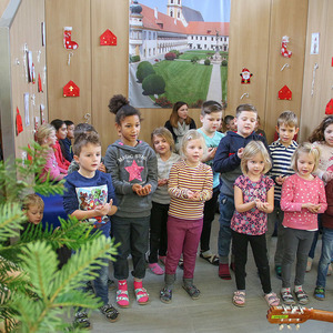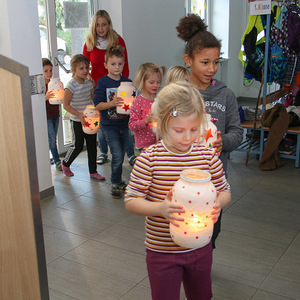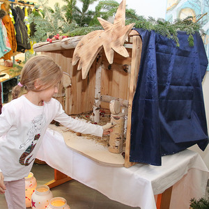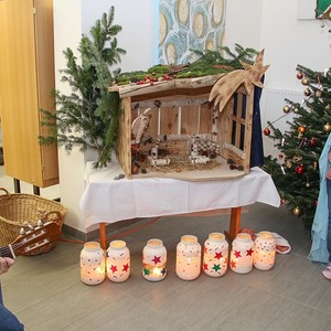 Zu Beginn zogen die Kinder in einer Lichterprozession zum Gemeinschaftsadventkalender, zum Christbaum und zur Krippe. Diese wurde während der Adventzeit mit den Kindern bestückt.