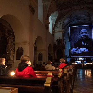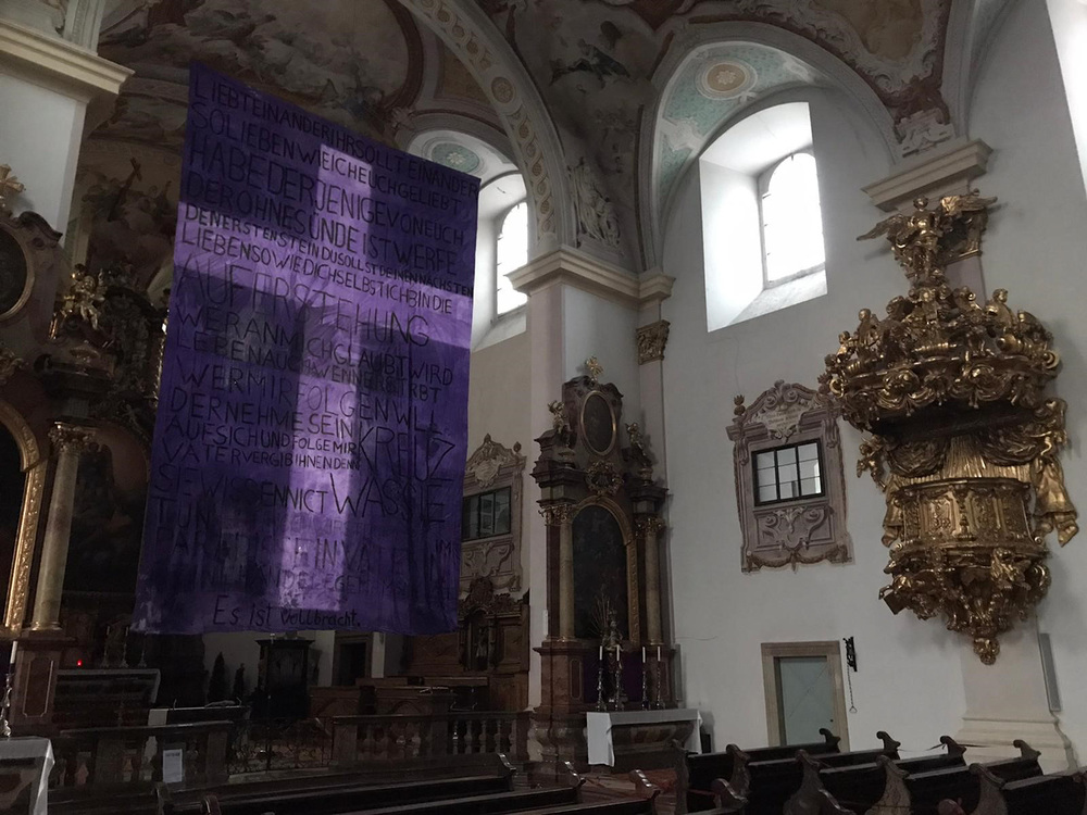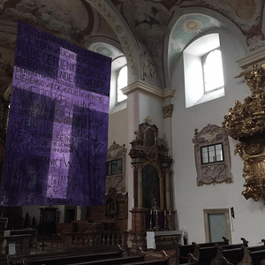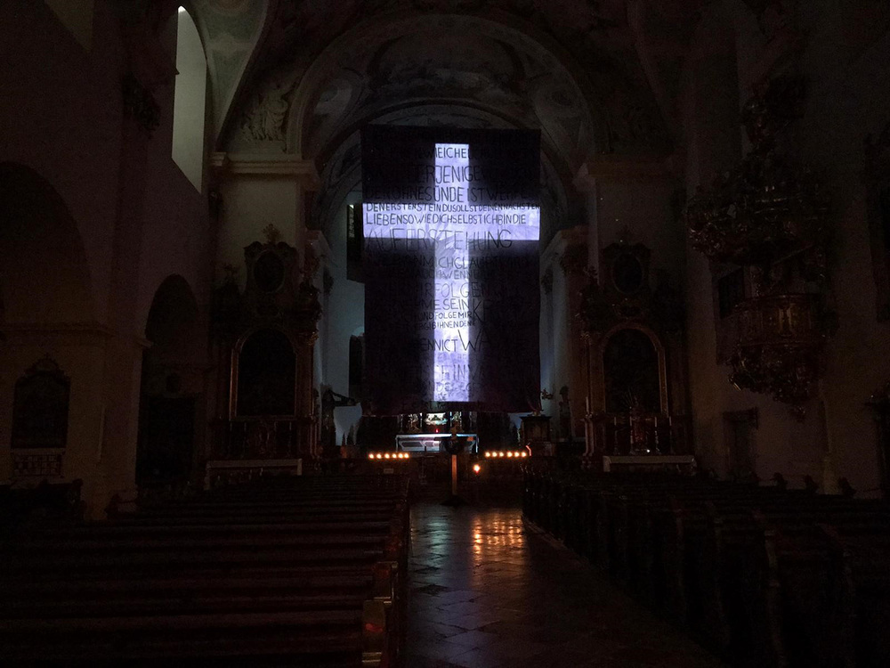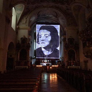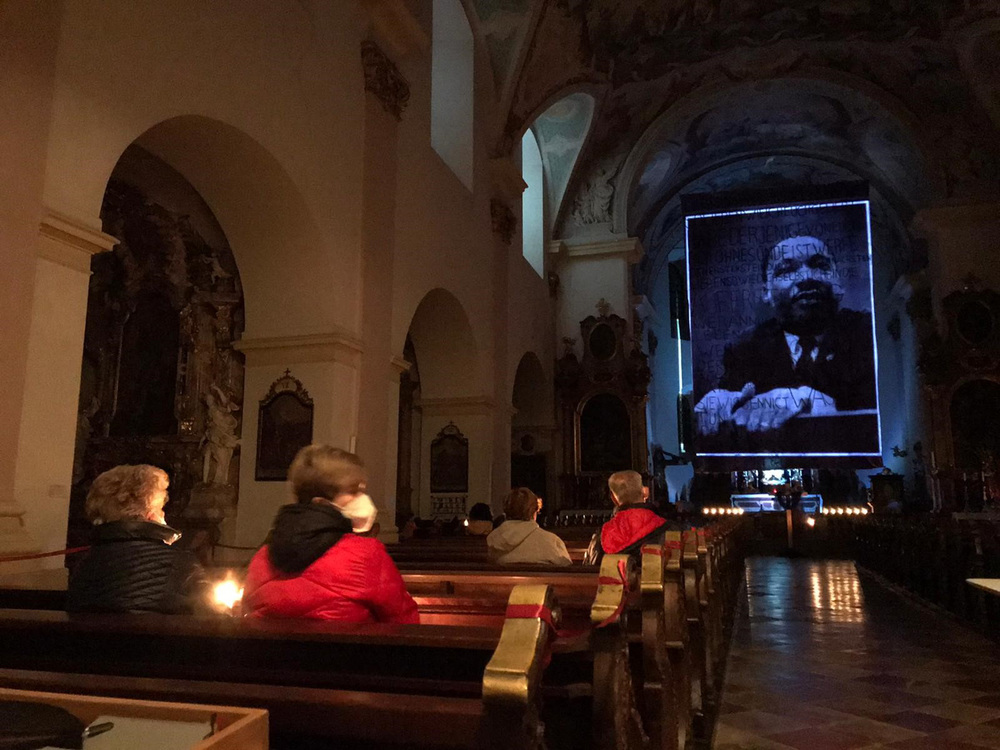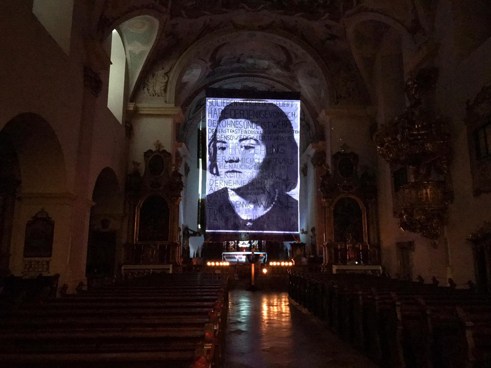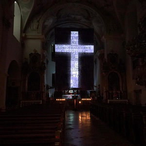 Die Bilder dieser beeindruckenden Persönlichkeiten wie z.B. Sophie Scholl und Dietrich Bonhoeffer wurden groß auf das Fastentuch in der Kirche projiziert. Am Ende des Kreuzwegs wurde auch noch an den Reichersberger Chorherren H. Rupert Haginger und an Frau Theresia Laus gedacht die beide gegen Ende des Krieges von Gestapo - Männern erschossen wurden.