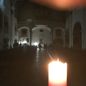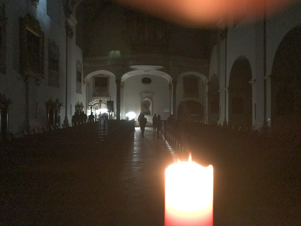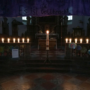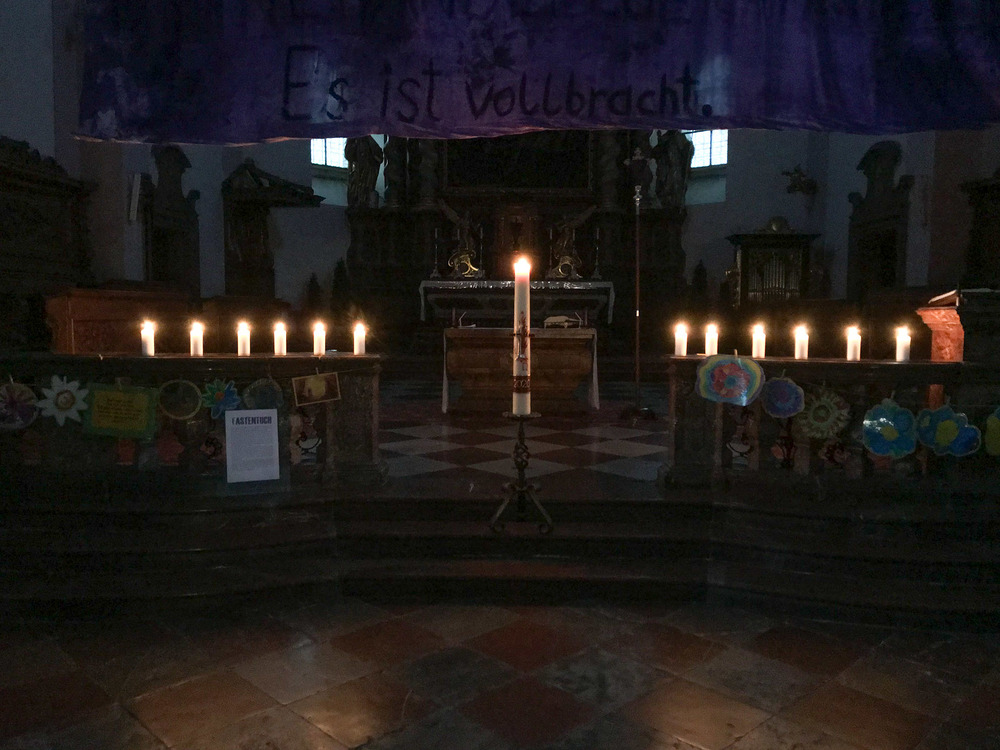 Um die Osterkerze waren 12 Kerzen aufgestellt, welche die 12 Apostel repräsentieren und damit auch uns. Bei jeder Station wurde es dunkler um die Osterkerze - Jesus. Bis zum Tod am Kreuz ist Jesus gegangen - in die totale Finsternis hinein.