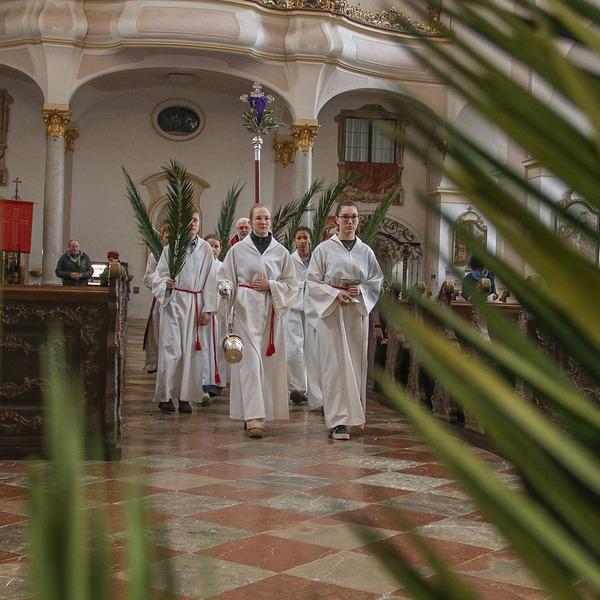 Mit den Palmzweigen und Palmbuschen in den Händen zieht die Gottesdienstgemeinde in festlicher Prozession zur Kirche. Jesu Einzug in Jerusalem wird mit Jubel- und Hosanna-Rufen nachempfunden.
