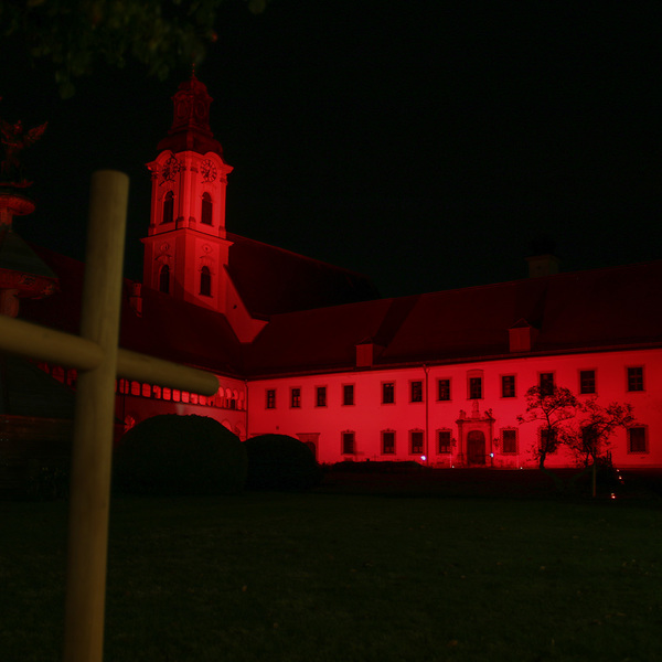 Vor der Kulisse des rot beleuchteten Stiftshofes wurde um 19.00 Uhr als Zeichen der Solidarität mit den weltweit mehr als 200 Millionen bedrängten, unterdrückten und oft um ihr Leben bangenden Schwestern und Brüdern der Kreuzweg gebetet.
