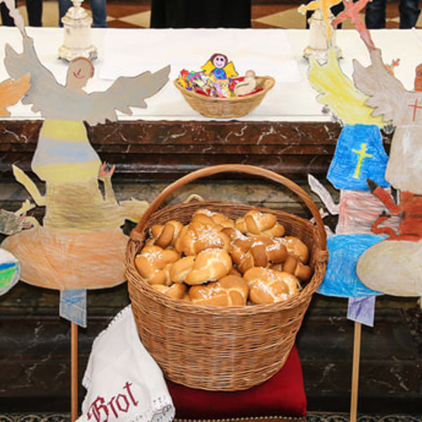 Die Kinder befüllten das vorbereitete Wagenrad mit den Gaben der Schöpfung. Mit Texten und Liedern gestalteten die Volkschulkinder diesen feierlichen Gottesdienst mit. Im Vaterunser-Kreis um den Altar wurde mit den Kindern die Mitte der Feier - die Eucharistie mit dem gegenwärtigen Herrn - zum Ausdruck gebracht.