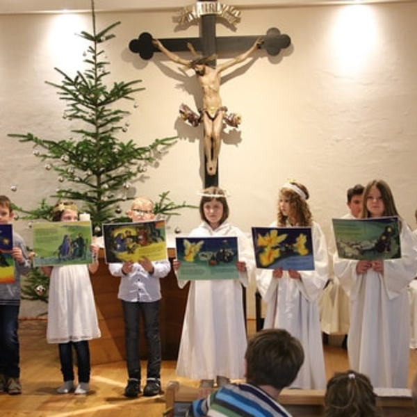 Kinder der Volksschule haben unterstützt durch ihre Lehrerin Karoline Zeilinger die Krippenfeier mit einem moderen Krippenspiel gestaltet. Zusammen mit einer kleinen Musikgruppe wurde so die Krippenfeier für die Kleinen in der vollbesetzten Hauskapelle zu einem großen Erlebnis.