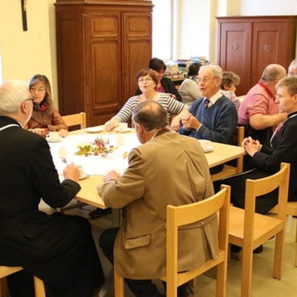 Von den Arkaden des Stiftshofes bot die Jagdhornbläsergruppe einige Stücke, während die Gottesdienstbesucher zu einer Kostprobe Stiftswein eingeladen waren.