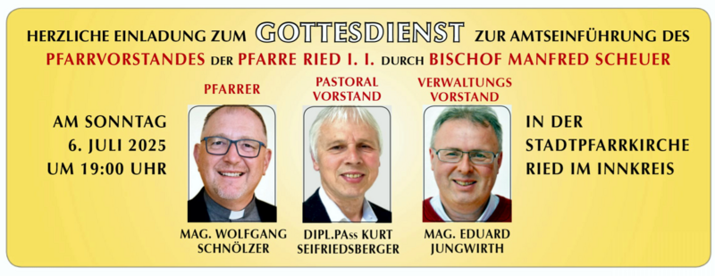 Mit einem feierlichen Gottesdienstes, zu dem die Gläubigen aller 19 Pfarrgemeinden ganz herzlich eingeladen sind, wird Bischof Manfred Scheuer am Sonntag, 6. Juli 2025, um 19.00 Uhr in der Stadtpfarrkirche den neuen Pfarrvorstand in sein Amt einführen. Dabei werden auch Vertreter:innen aller 19 Pfarrgemeinden dem neuen Pfarrvorstand ihre Mitarbeit versprechen.