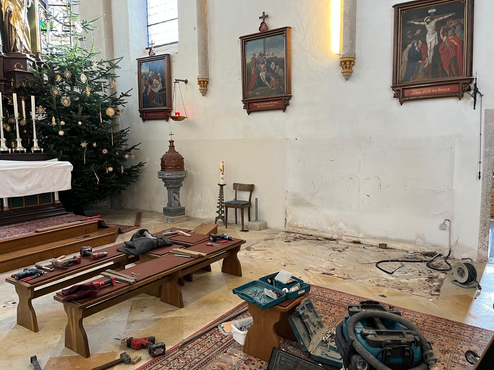 Im Zuge der Vorarbeiten wurden am 5. Jänner 2026 die Seitenbänke im Altarraum abgebaut. Dadurch entsteht spürbar mehr Raum für die liturgischen Feiern und besondere Gottesdienste.