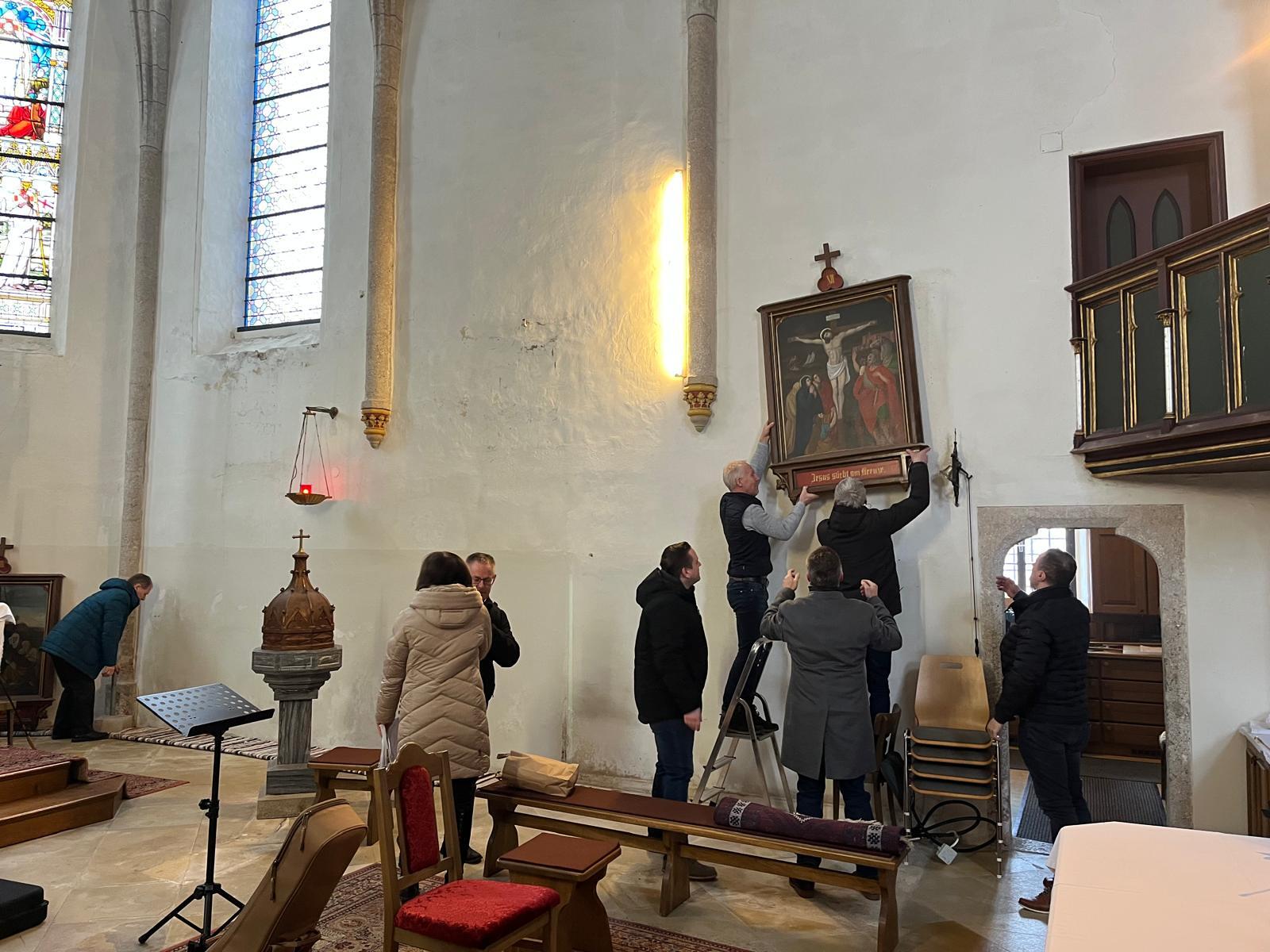 Die Kreuzwegbilder wurden sorgfältig abgenommen und fachgerecht im Pfarrhof eingelagert, um sie während der Bauphase vor Staub und möglichen Beschädigungen zu schützen. Nach Abschluss der Renovierungsarbeiten werden sie selbstverständlich wieder an ihren angestammten Platz zurückkehren.