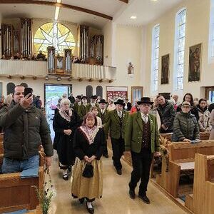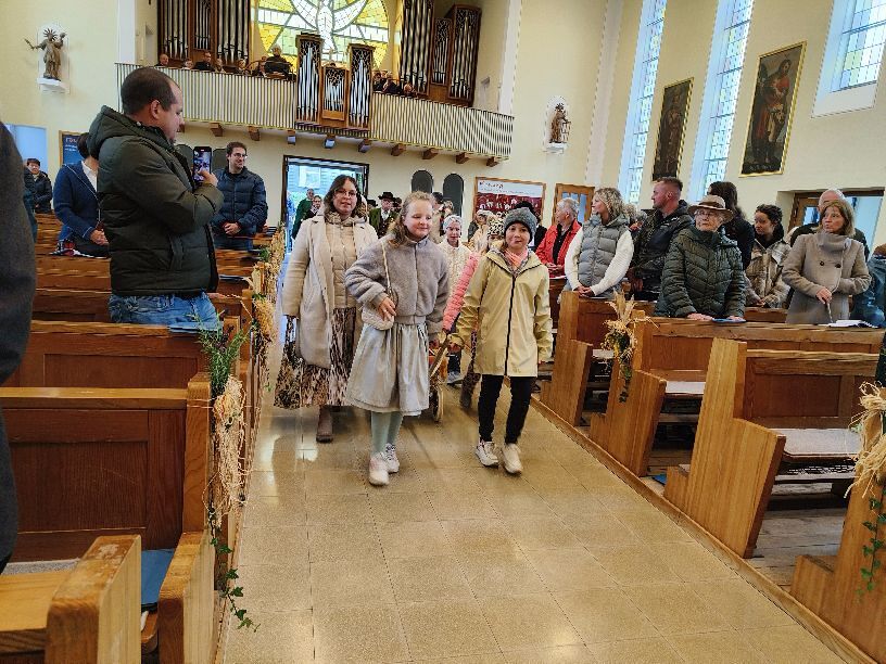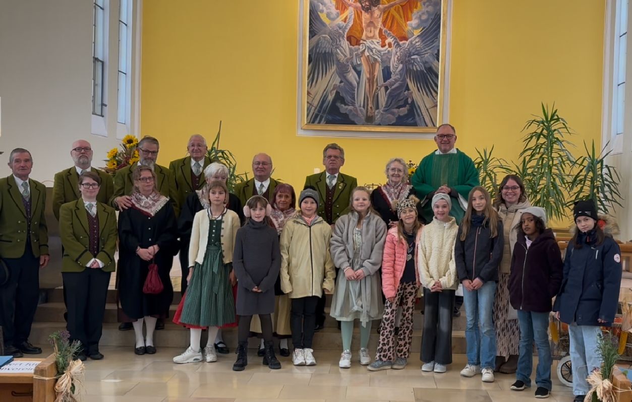 Feierlich zogen die Jungscharkinder mit ihrem Erntewagen, gefolgt von Mitgliedern des Trachtenvereins Ried, in die Kirche ein.