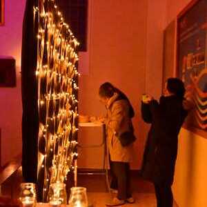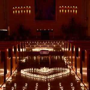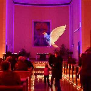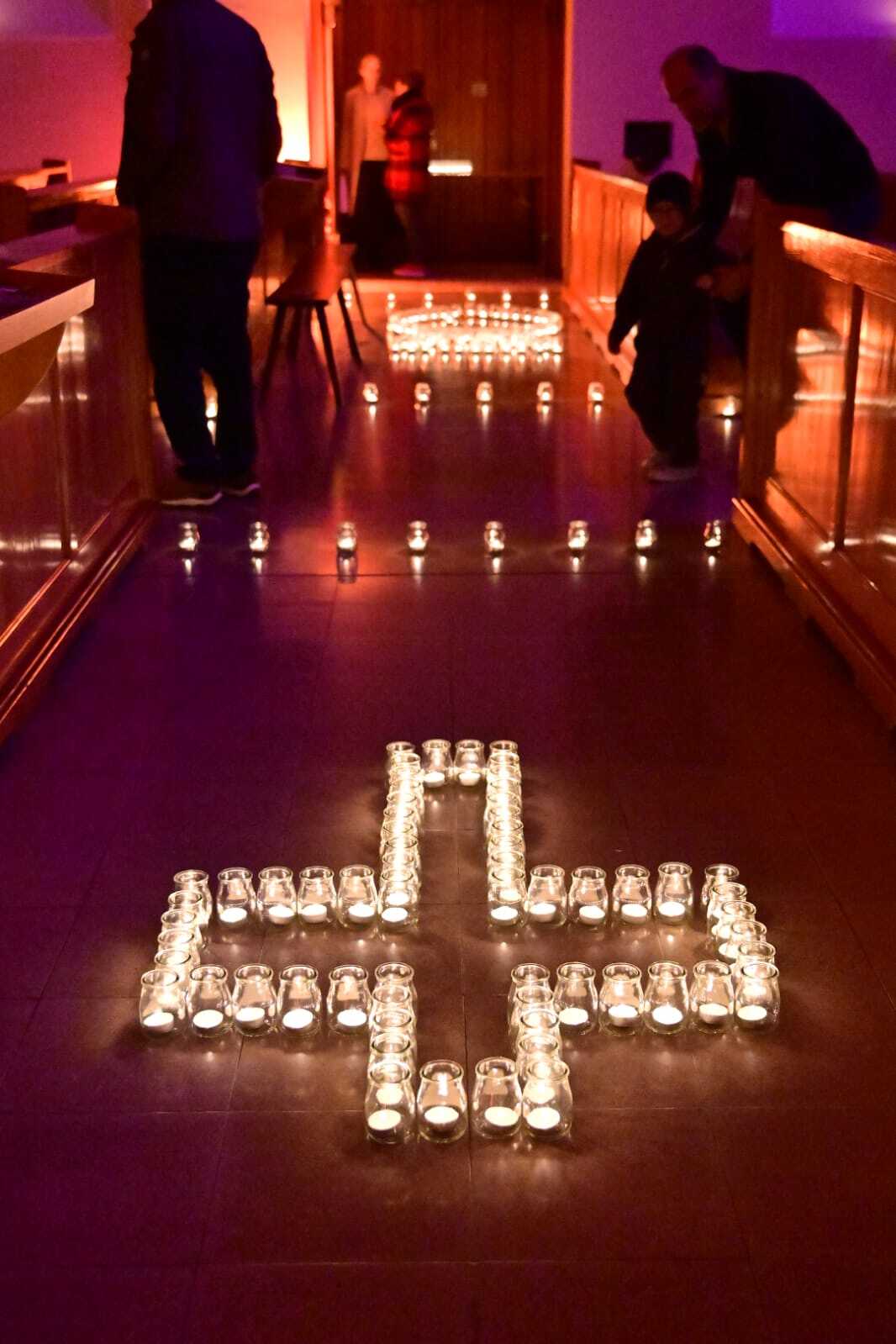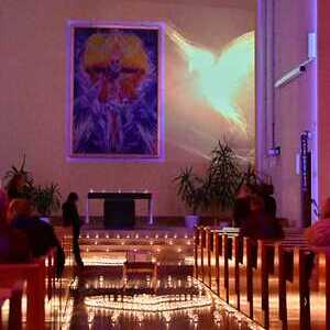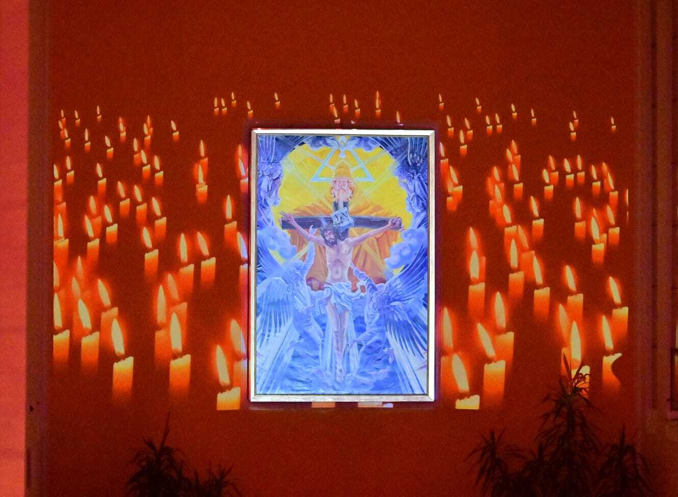 Über 200 Interessierte nutzten die Zeit, um in einer Kirchenbank die Stimmung aufzunehmen und zur Ruhe zu kommen, solange sie mochten. Heuer als neue Besonderheit: Auf der großen Wand hinter dem Altar der Riedbergkirche wurden mithilfe eines Beamers riesige Projektionen gezeigt, von animierten Kerzen, über große fliegende Friedenstauben bis hin zum stimmungsvoll animierten Ausleuchten unseres großen Altarbildes.
