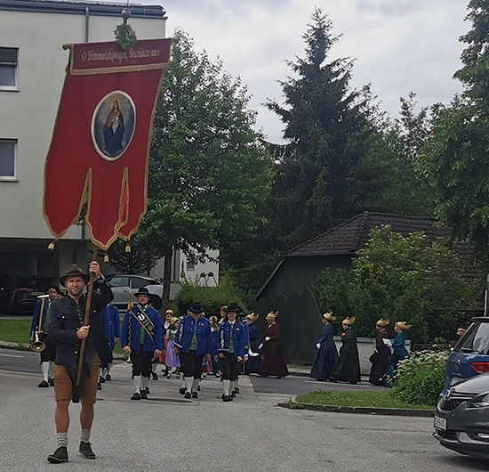 Erstmals war das Kriegerdenkmal vor der Kirche die 1. Station. Angeführt wurde die Prozession vom Fahnenträger, es folgte der Musikverein, die Goldhauben, die Erstkommunikanten, die Ministranten, Pater Maximilian mit der Monstranz und dem Himmel, der Vorbeter, der Kirchenchor und das Volk.