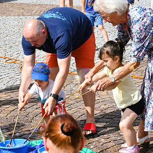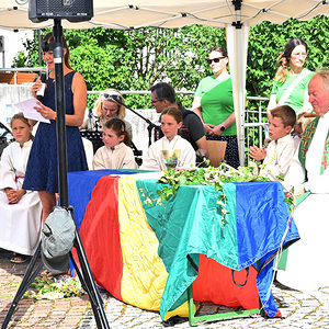 Mit diesen Worten wurde die Fronleichnams-Prozession im Hinblick auf die unsichere Wetterlage begonnen. Pater Maximilian leitete den Gottesdienst. Er staunte nur zurecht über die reibungslose Darstellung der vorbereiteten Geschichte als Theaterstück der Erstkommunikanten. Die Geschichte handelt von einem Königskind, das alles von seinem Vater bekam, nur die Zuwendung und Liebe der Menschen nicht. Als ein Bäckerjunge sich zu diesem Königskind heimlich dazustahl, blühte es wieder auf, sodass es am Ende auch der König einsehen mußte. Jeder Mensch und besonders heranwachsende Kinder brauchen die Zuwendung und Liebe eines Menschen.