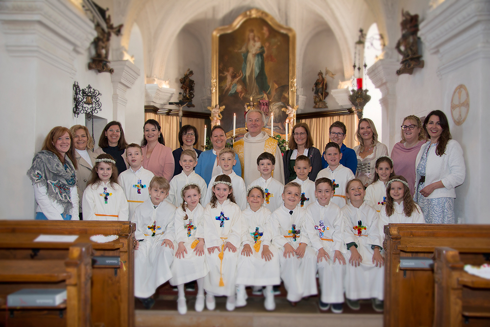 Am 9. Mai feierten 16 Kinder aus unserer Gemeinde ihre Erstkommunion unter dem Motto „Jesus – Brot für unser Herz“. Bei strahlendem Sonnenschein zogen die Kinder, begleitet von ihren Tischmüttern in die festlich geschmückte Pfarrkirche ein. Besonders stolz trugen sie die selbst gestalteten Glaskreuze, die sie in der Stiftsglaserei Schlierbach gefertigt hatten.