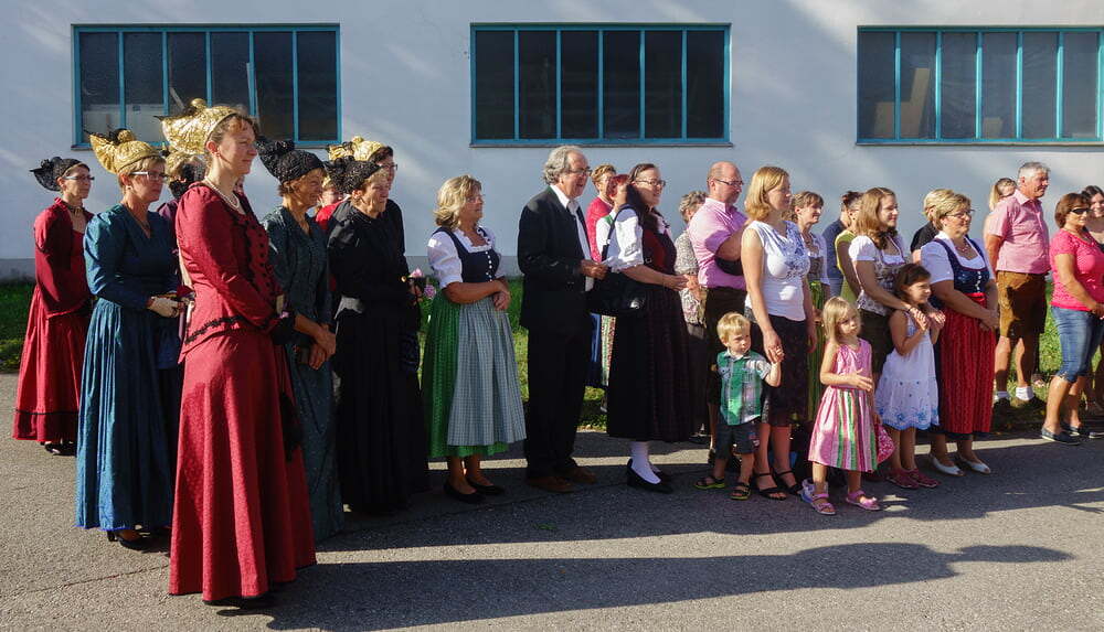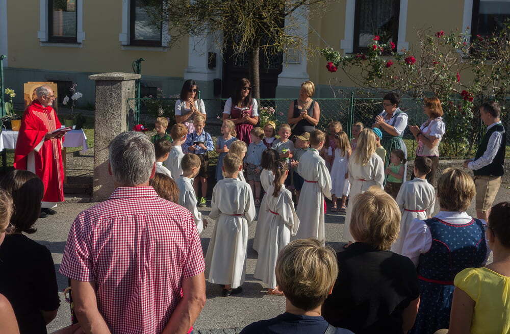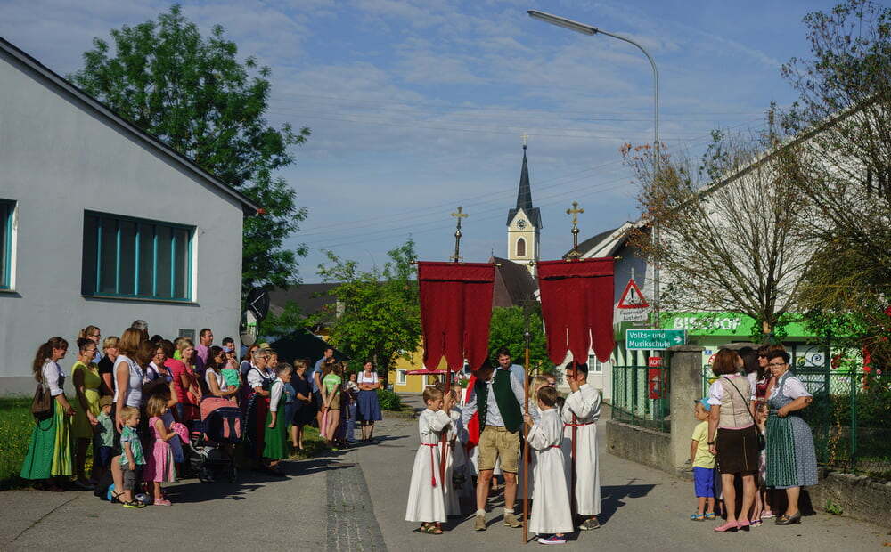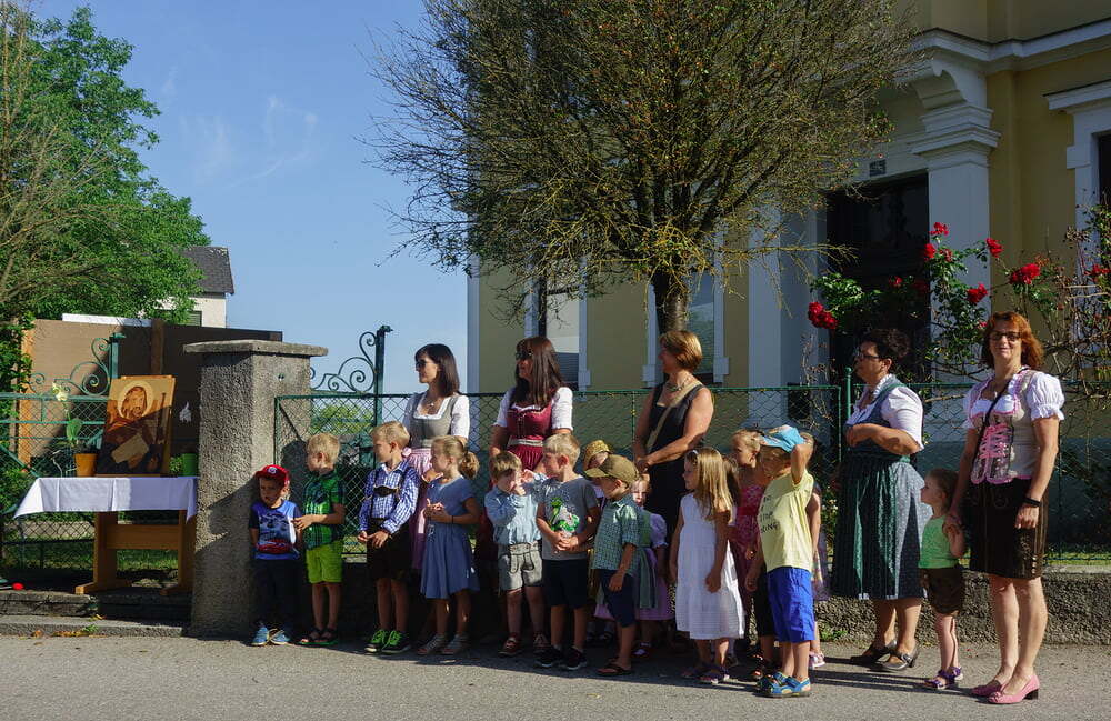 Das Intarsienbild, welches das ganze Jahr über im Jakobusstüberl hängt und dort über viele Sitzungen wacht, wurde gesegnet und anschließend zogen unter den festlichen Prozessionsmärschen des Musikvereins Roitham, Freiwillige Feuerwehr, Kindergartenkinder, Goldhauben- & Kopftuchgruppe, Ministranten & Priester und schließlich die versammelte Festgemeinde in feierlicher Prozession zur Pfarrkirche.