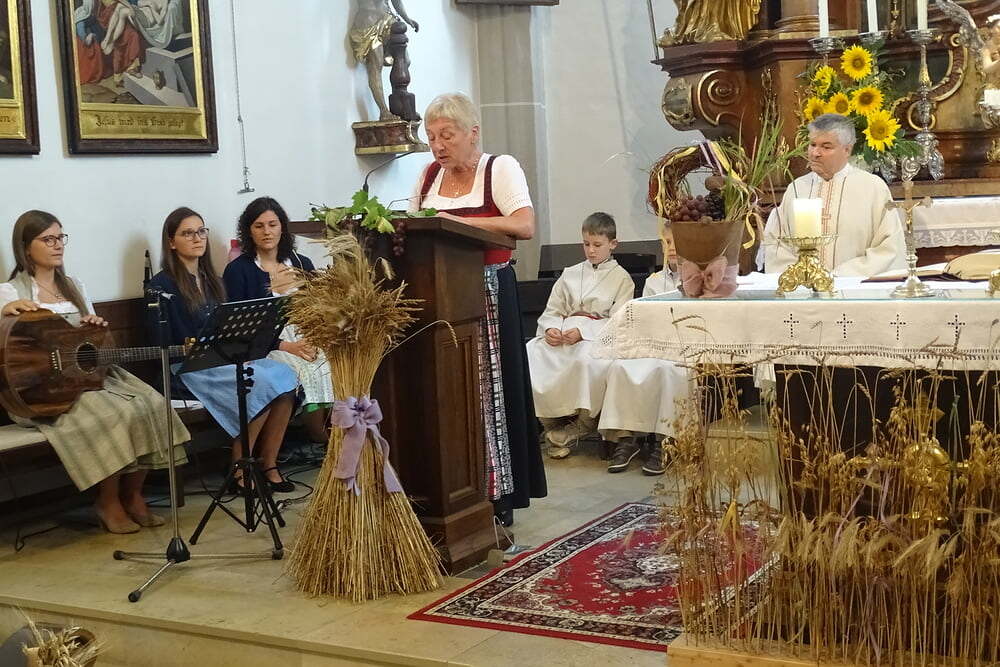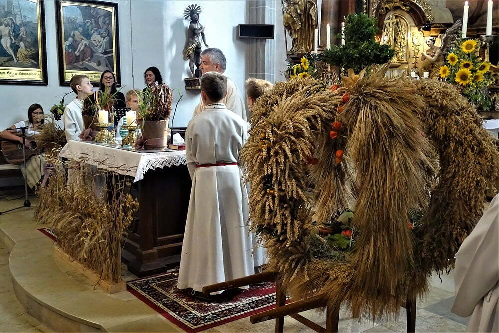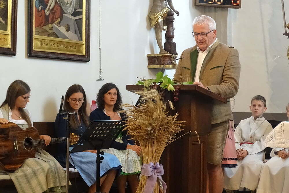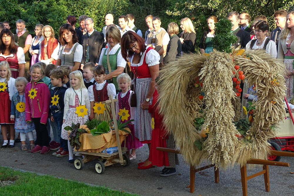 Nach seiner Begrüßung bei der Schöberlkapelle, erfreuten uns die Kindergartenkinder mit einem musikalischen Beitrag, bevor die Erntekrone und die Erntegaben gesegnet wurden.