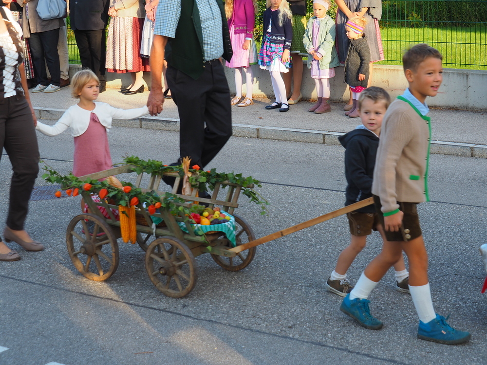 Unsere jungen Burschen trugen die Erntekrone und unsere Jüngsten zogen die Erntegaben mit Leiterwagen und Trettraktor.