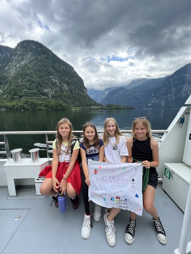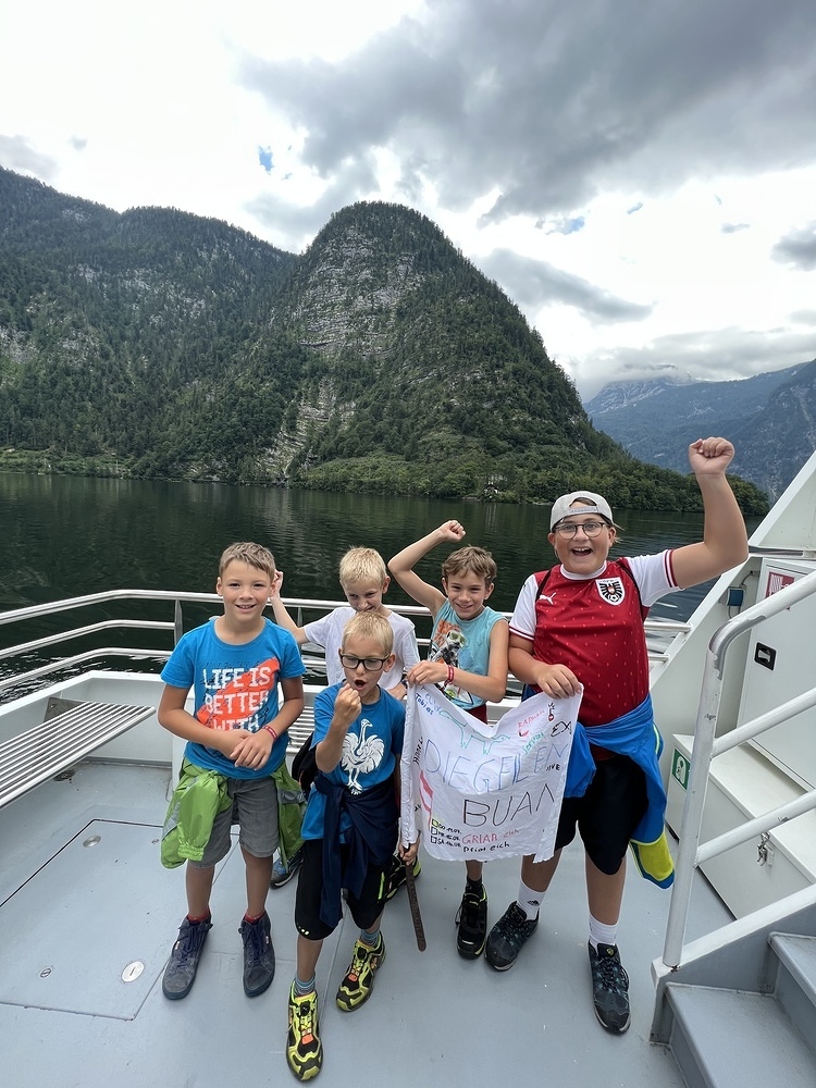 Am Freitag regnete es am Vormittag und so begaben wir uns auf eine entspannende Meditationsreise und begegneten dabei unserem „Krafttier“. Am Nachmittag war das Wetter wieder besser und so fuhren wir mit dem Schiff nach Hallstatt, um dort unsere zuvor gebastelten Reiserosenkränze in der Kirche zu weihen. Am Abend konnten sich die Kinder noch bei der Zeitungsmodenschau künstlerisch entfalten und „tierische Kreationen“ entwerfen.