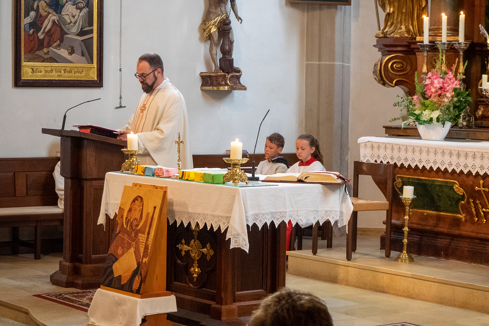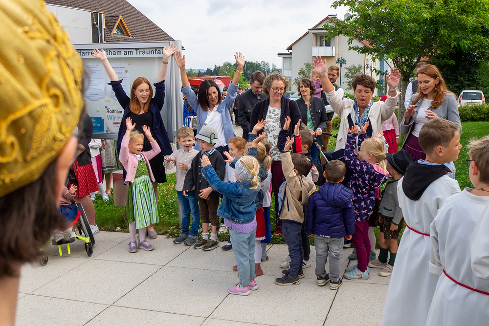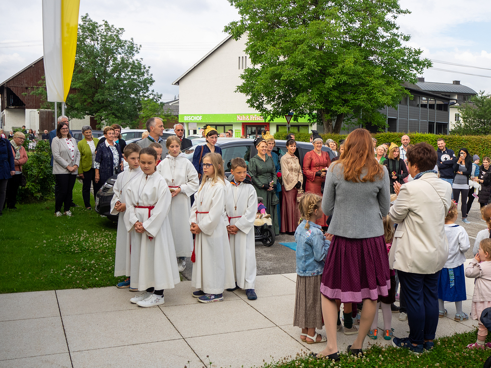 Pater Prior Jakob vom Stift Lambach begrüßte die Festgemeinde, die sich vor dem JakobiZentrum um das Intarsienbild des Hl. Jakobus versammelt hatte. Die Kindergartenkinder beteiligten sich in traditioneller Art und Weise mit einem Lied, bevor wir begleitet vom Musikverein zur Pfarrkirche zogen und dort die Festmesse feierten.