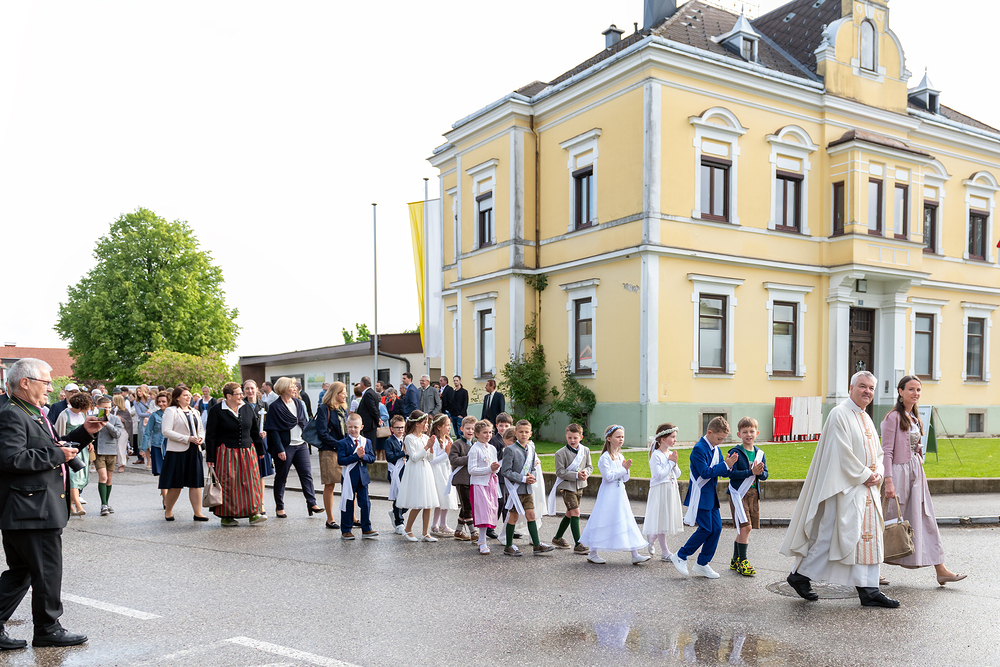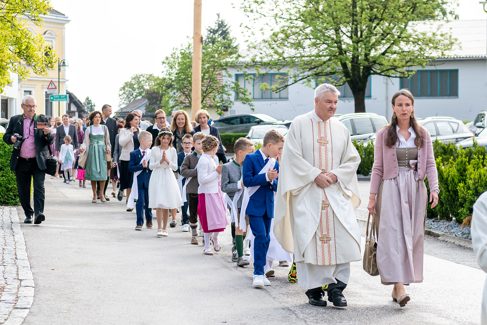 13 Mädchen und Buben feierten am 04.05. mit Pfarrer Franz Starlinger, ihren Familien und Freunden die Erstkommunion. Feierlich zogen die Kinder mit unserem Herrn Pfarrer, den Ministranten begleitet vom MV Roitham am Traunfall in die Kirche ein, wo wie zum ersten Mal das Sakrament der Hl. Kommunion empfangen haben. Nach dem feierlichen Gottesdienst lud die Pfarre die Erstkommunionkinder mit einer Begleitperson zum traditionellen Frühstück ins JakobiZentrum ein. Ein herzliches DANKE an alle, die zum Gelingen dieses Festes beigetragen haben.