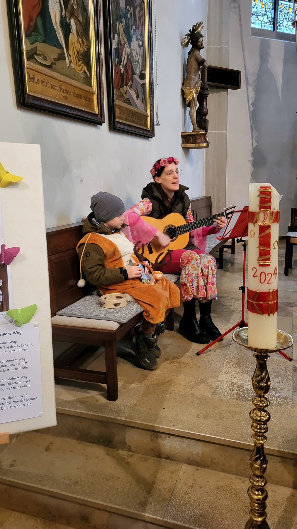 Lotta freute sich so über ihren neuen Faschingshut, dass sie mit den Kindern einen klingenden Jubelruf ertönen lies. Das ließen sich die jungen Gottesdienstbesucher nicht zweimal sagen und stimmten mit Rasseln, Klanghölzern, Glöckchen und Schellen mit ein.