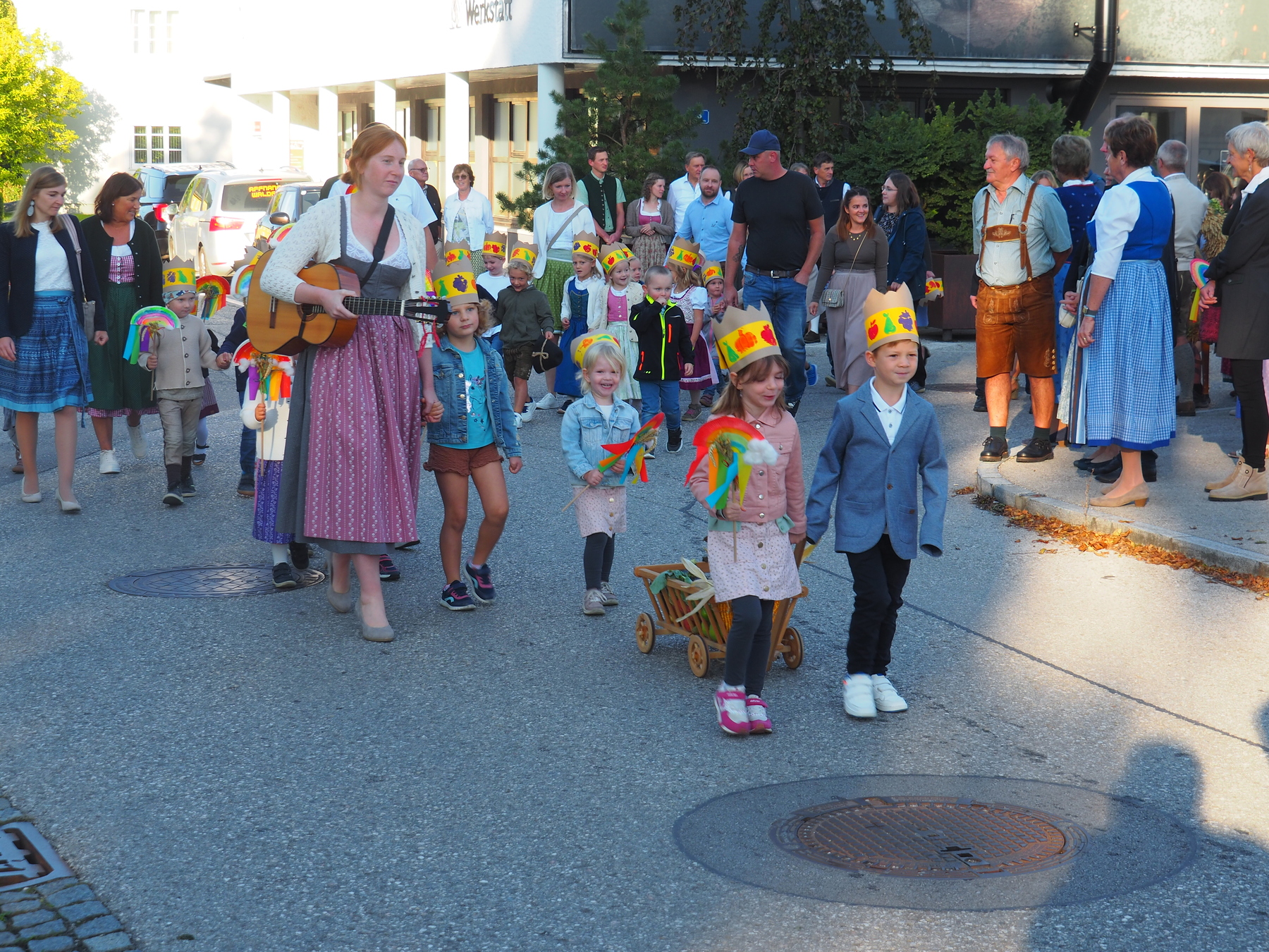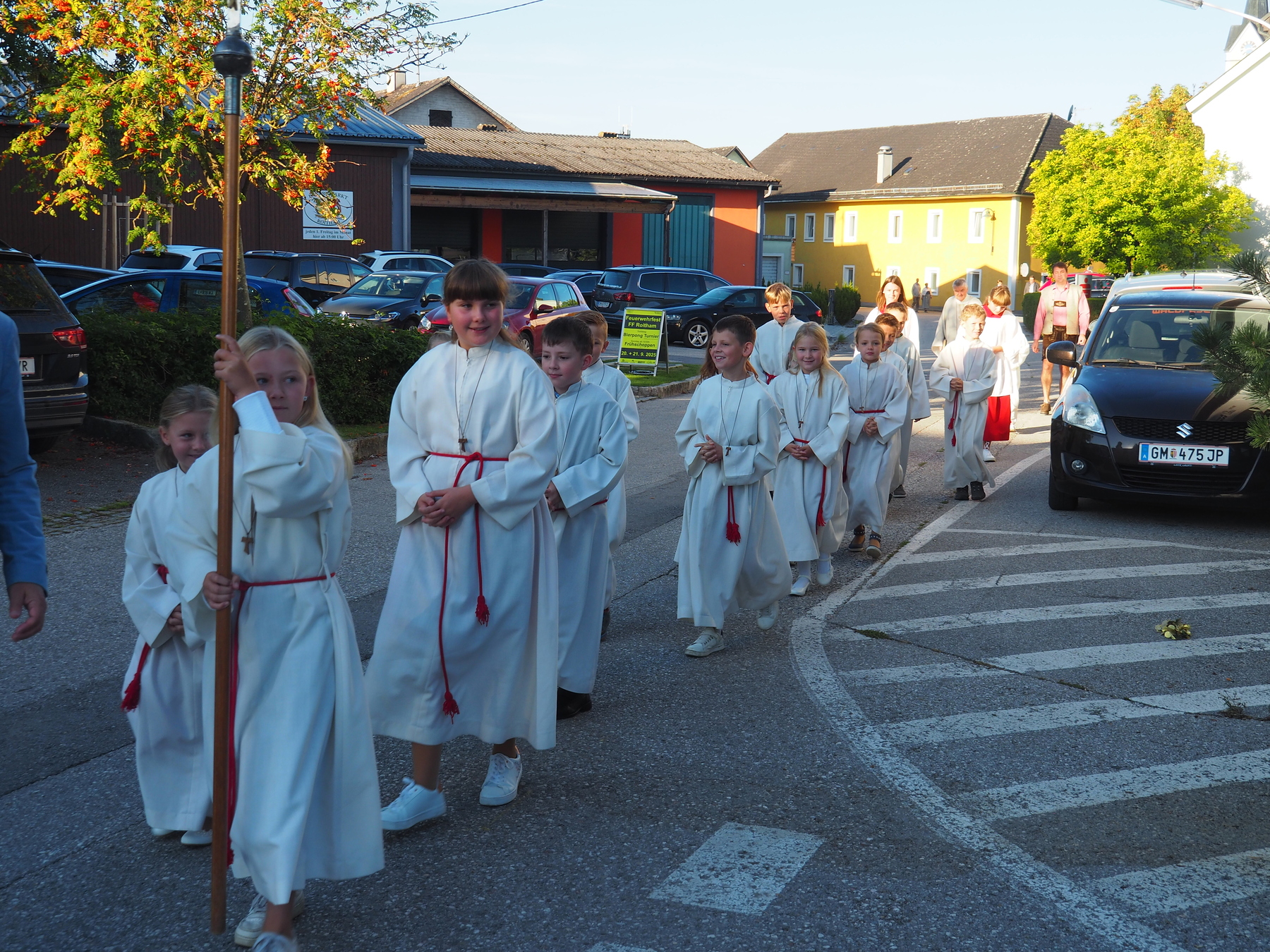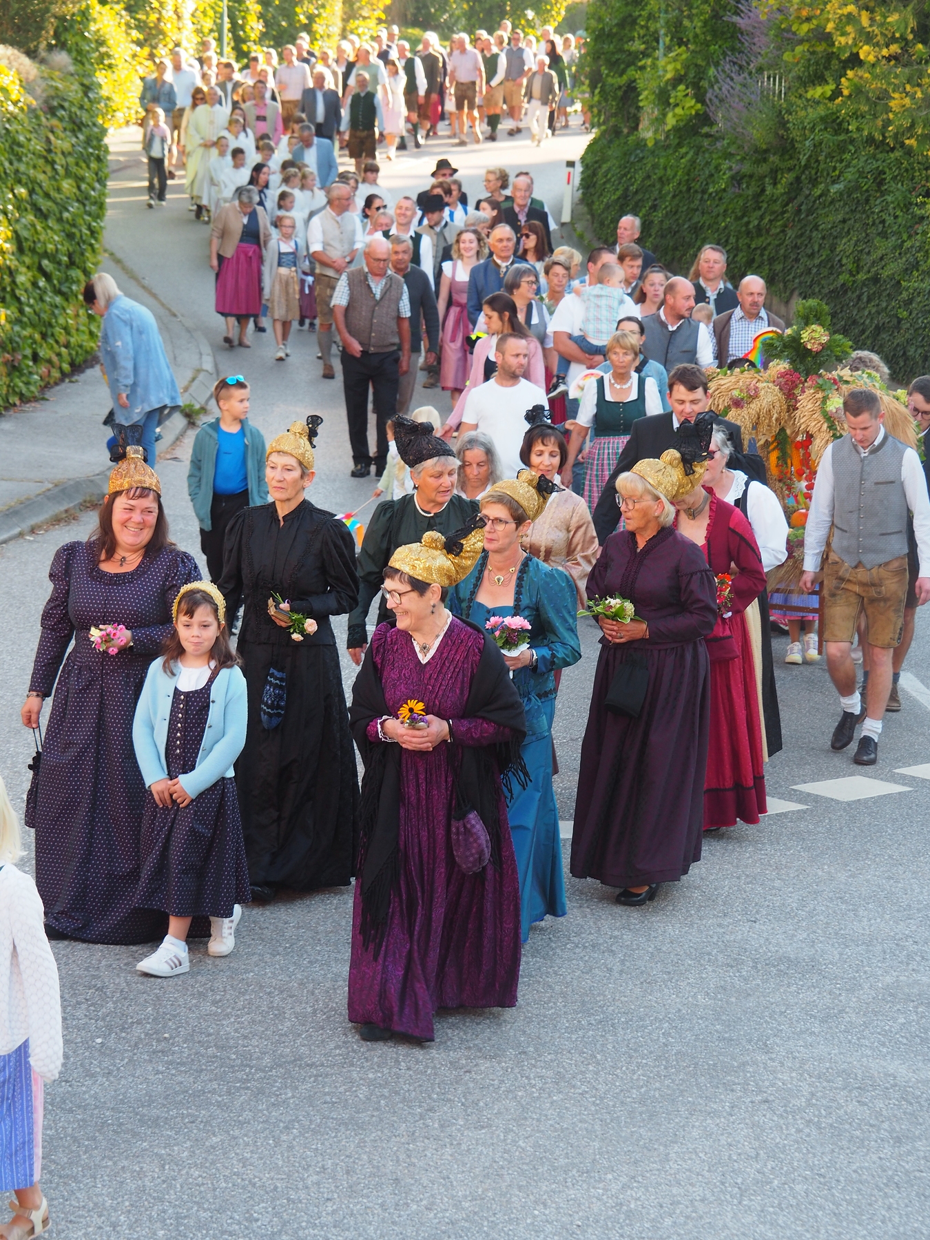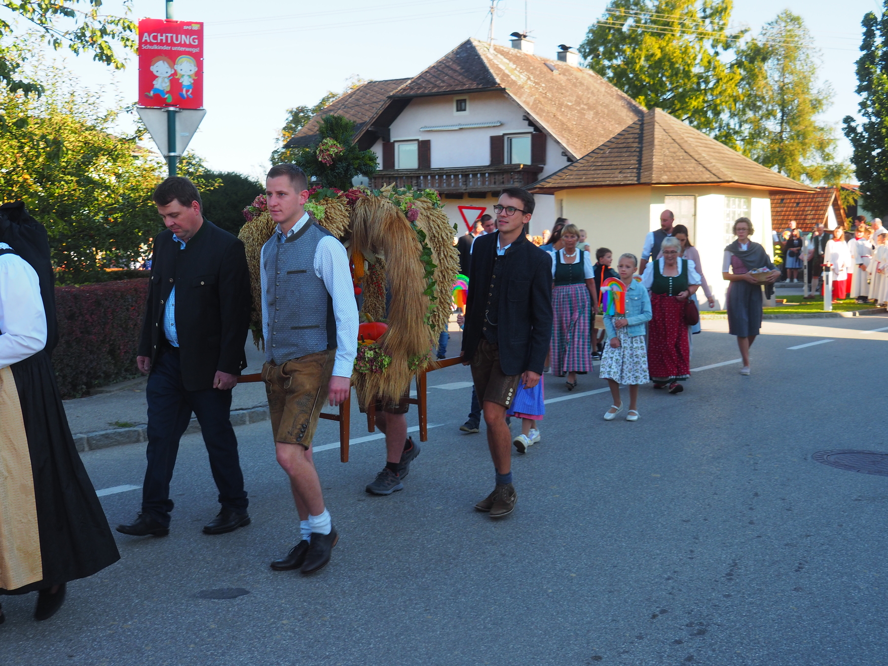 Unser Herr Pfarrer Franz Starlinger holte mit einer großen Schar an Ministranten/innen, den Musikverein, die Kindergartenkinder und die Pfarrbevölkerung der o.g. Ortschaften mit der Erntekrone beim JakobiZentrum ab. Gemeinsam gingen wir zur Schöberlkapelle, wo die Erntekrone geweiht wurde und die Kindergartenkinder ihr Erntedanklied sangen.