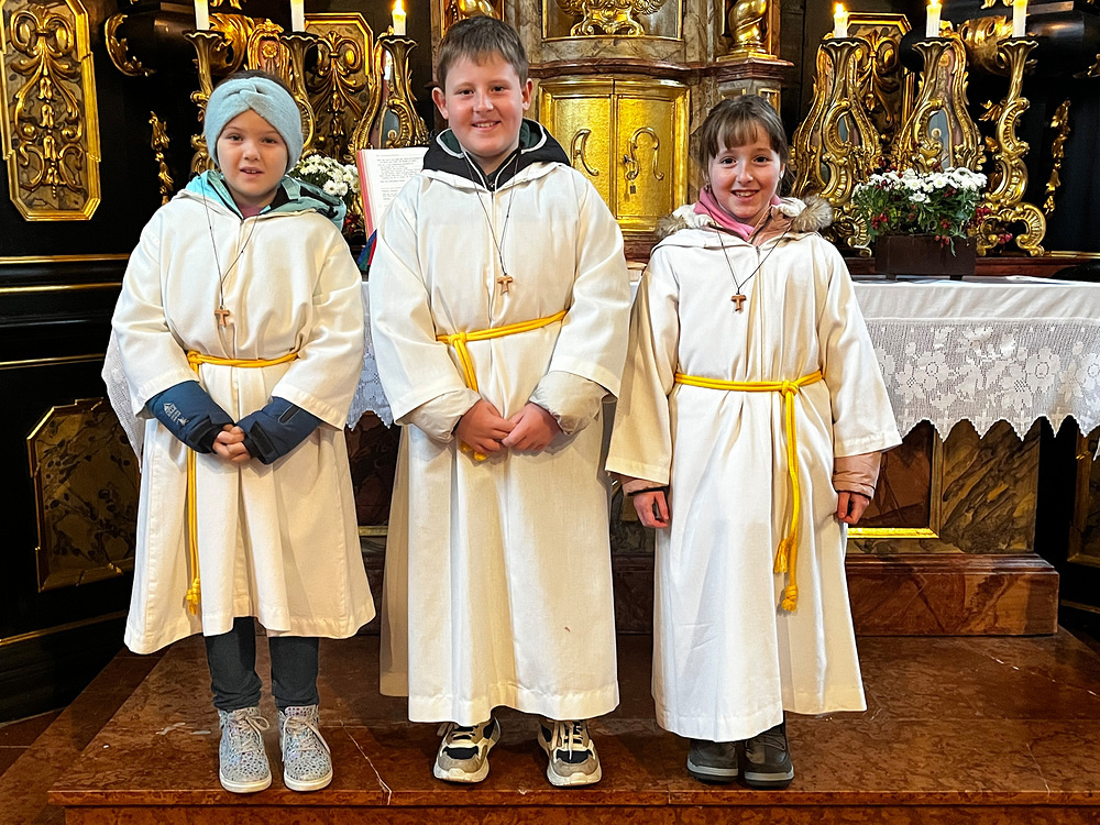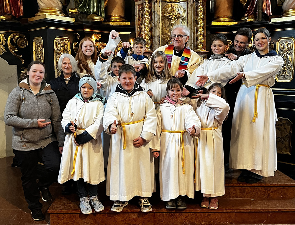 Den jungen Dienern am Tisch des Herrn – Victoria, Valentina und Samuel – wurde das Ministrantenkleid angelegt. Pfarrer Helmut Part segnete die Kreuze und legte sie den Kindern feierlich um. Die Gläubigen applaudierten herzlich und zeigten ihre Unterstützung.