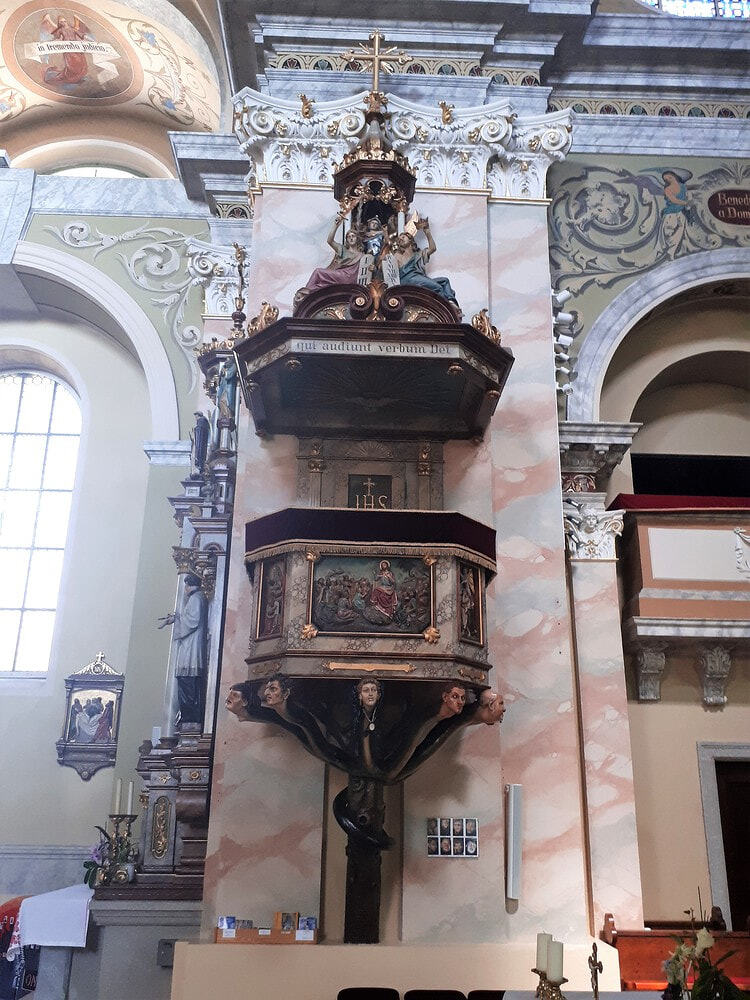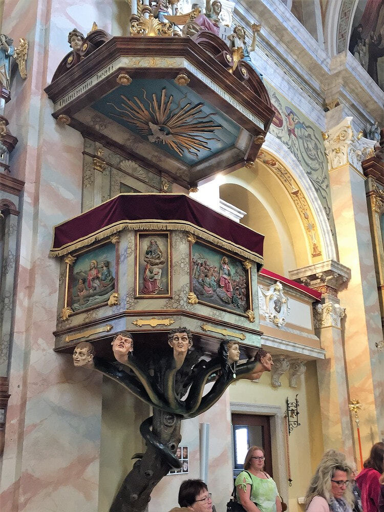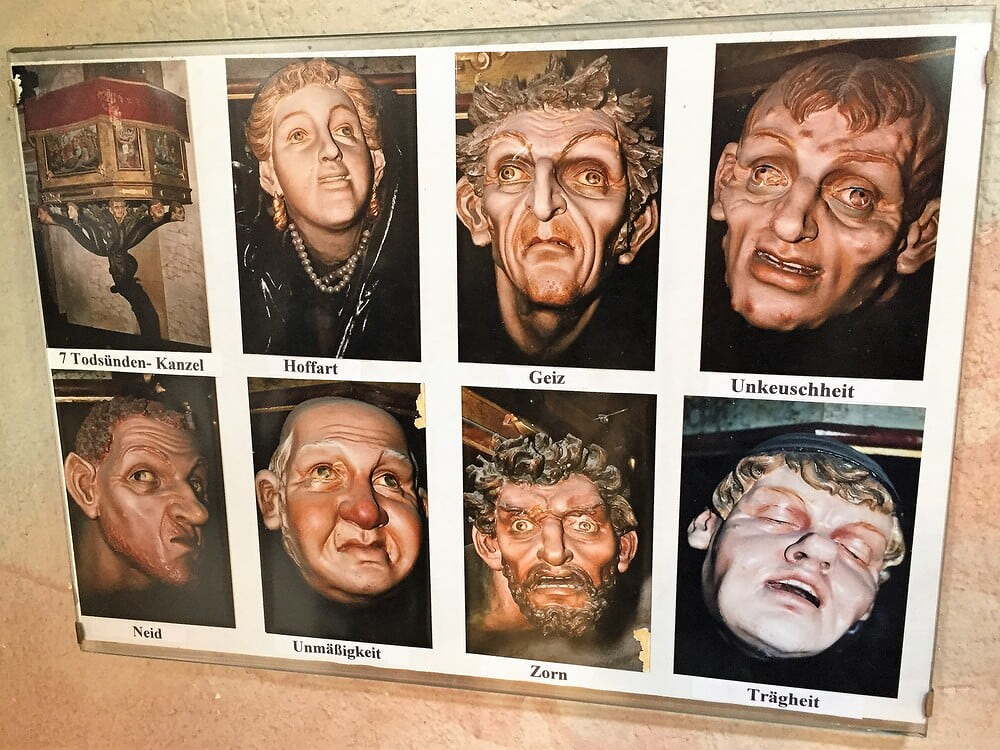 Die sogenannte berühmte Todsündenkanzel wird von einem Baumstamm getragen, um den sich eine Riesenschlange windet. In sieben Hälsen an deren Ende Menschenköpfe sitzen, werden die sieben Todsünden - Hoffart, Unkeuschheit, Trägheit, Neid, Unmäßigkeit, Geiz und Zorn, dargestellt.