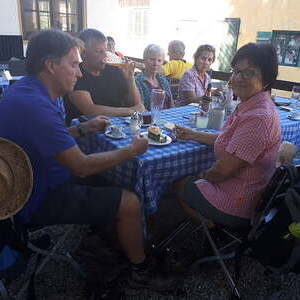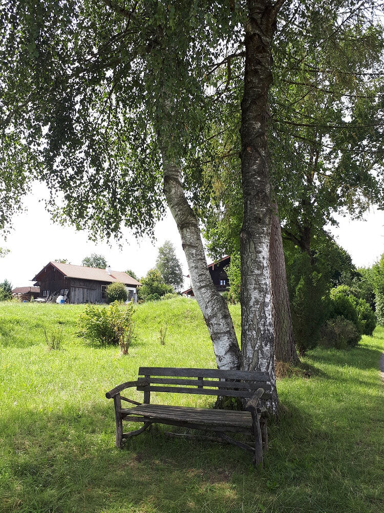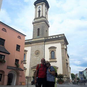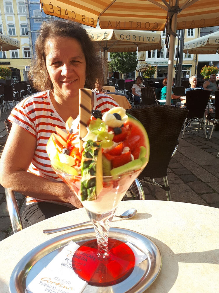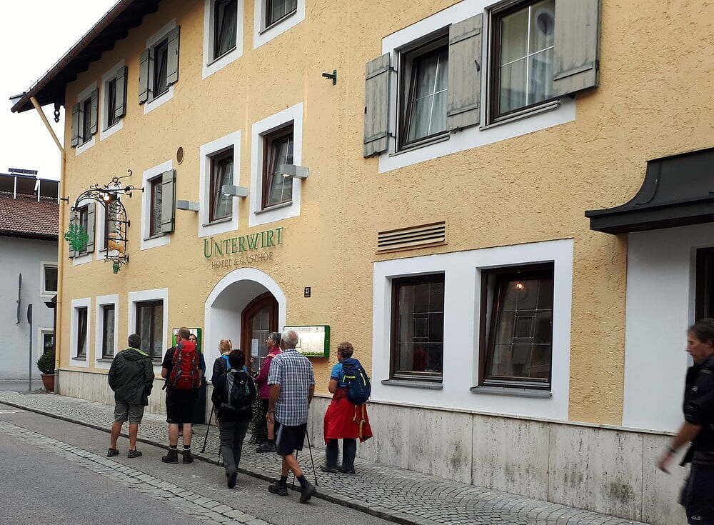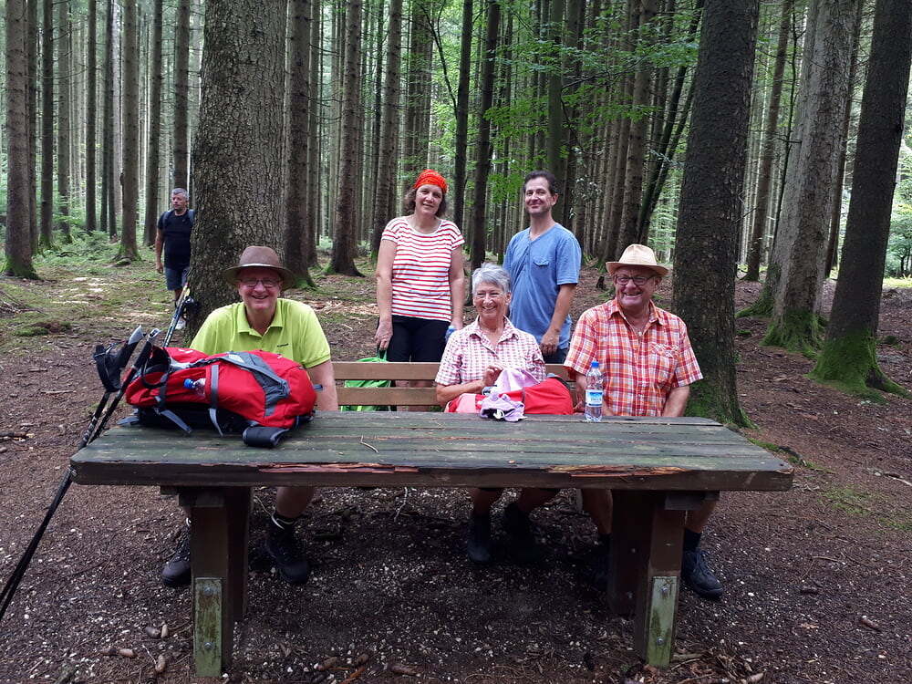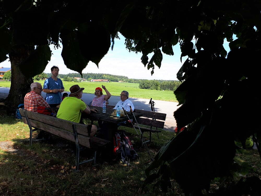 2. Tag: Strahlender Sonnenschein. Wir begannen mit einem kurzen Morgenlob in der schönen Naturlandschaft im Rupertiwinkel. Im Schweigend-Gehen konzentrierten wir uns auf das "Jetzt" (gestern ist ein Traum und morgen ist eine Vision). Wir picknickten im Wald und erfreuen uns an Gottes schöner Schöpfung. Am frühen Nachmittag erreichten wir nach etwa 22 km, unser Ziel: die Stadt Traunstein. Wir belohnten uns mit Weißbier, guter bayrischer Küche (Schweinshaxn), Kaffee, Kuchen, Eis und waren dankbar, dass wir dieses Pilgern als "Genußpilgern" genießen konnten. Leider war die Kirche in Traunstein wegen Renovierungsarbeiten geschlossen und somit ist der Abendgottesdienst entfallen.