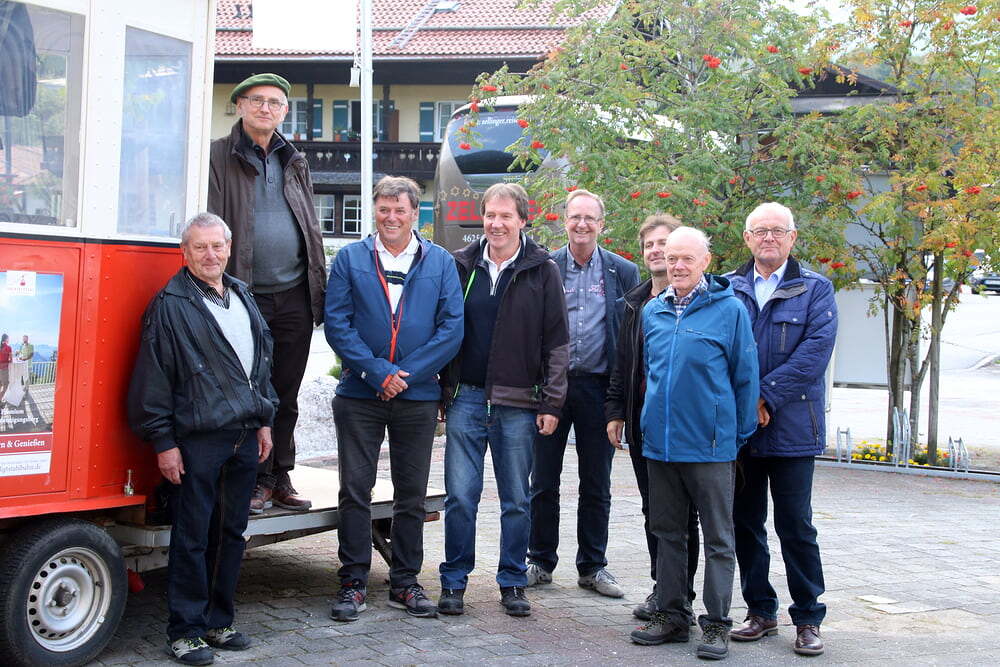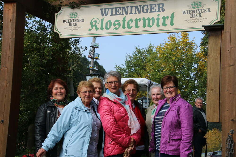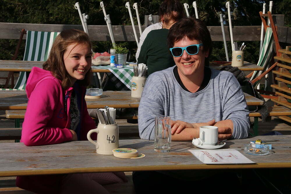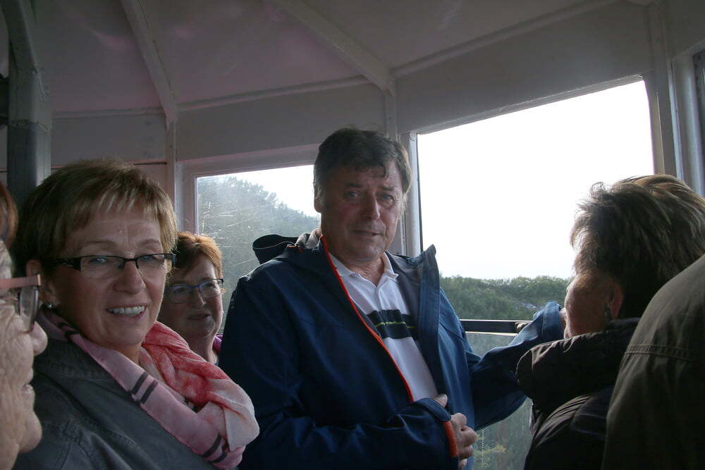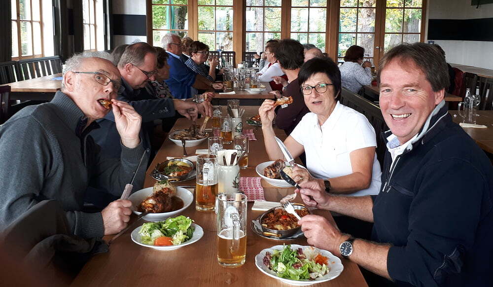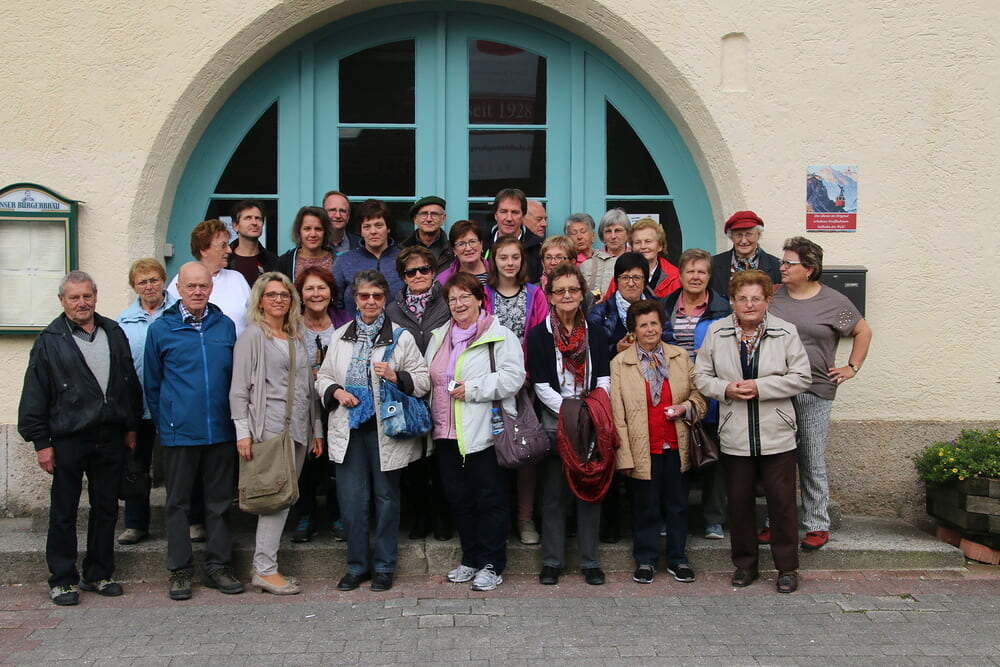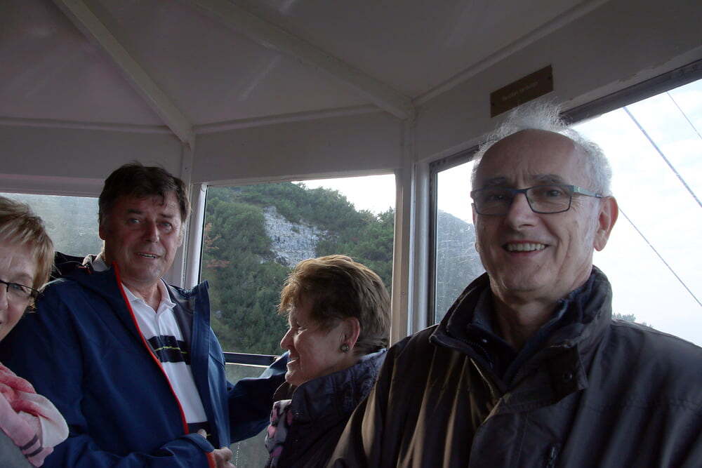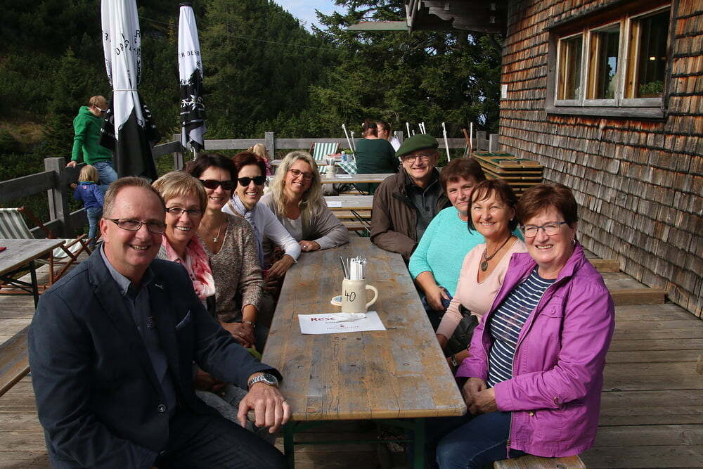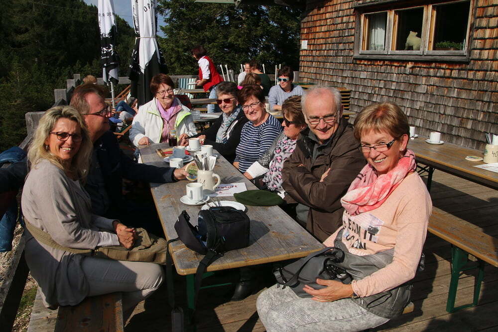 Nach dem Mittagessen fuhren wir weiter nach Bad Reichenhall. Mit der ältesten im Original erhaltenen Großkabinenseilbahn der Welt ging es auf den Predigtstuhl. Das Wetter bot uns einen Blick vom Chiemsee über den Wilden Kaiser bis hinein zu den Loferer Steinbergen. Sehr gemütlich genossen wir auf der Sonnenterrasse in der Almhütte Schlegelmulde die wärmenden Sonnenstrahlen, Kaffee und Kuchen. Glücklich, dass alle nach einer längeren Wartezeit auf die Abfahrt wieder beim Bus ankamen, machten wir uns auf die Heimreise. Danke allen, für den schönen gemeinsam verbrachten Tag.