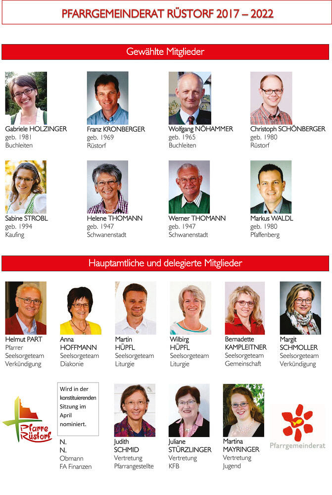 Der neue Pfarrgemeinderat für die Periode von 2017 bis 2022 ist gewählt. Die gewählten, hauptamtlichen und delegierten Mitglieder finden Sie hier auf der Pfarrhomepage und im Aushang vor der Kirche. Wir freuen uns auf spannende fünf Jahre und wünschen dem neuen Team alles Gute!