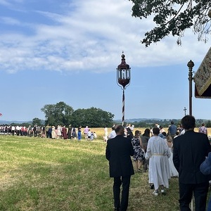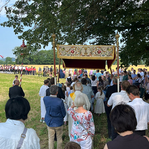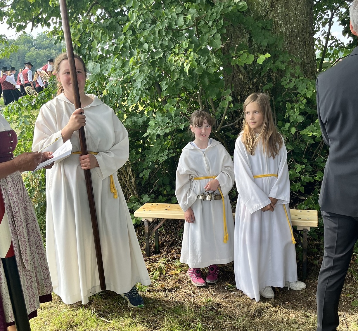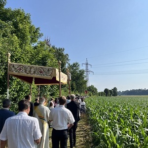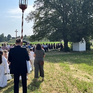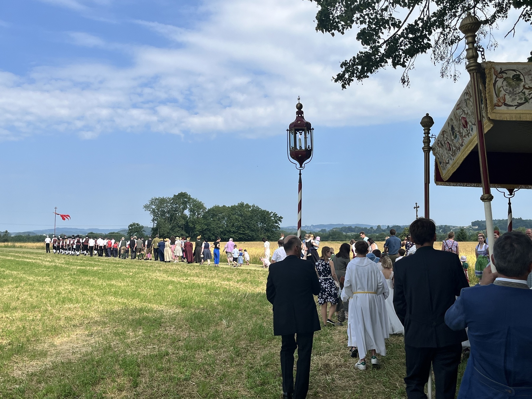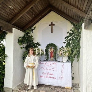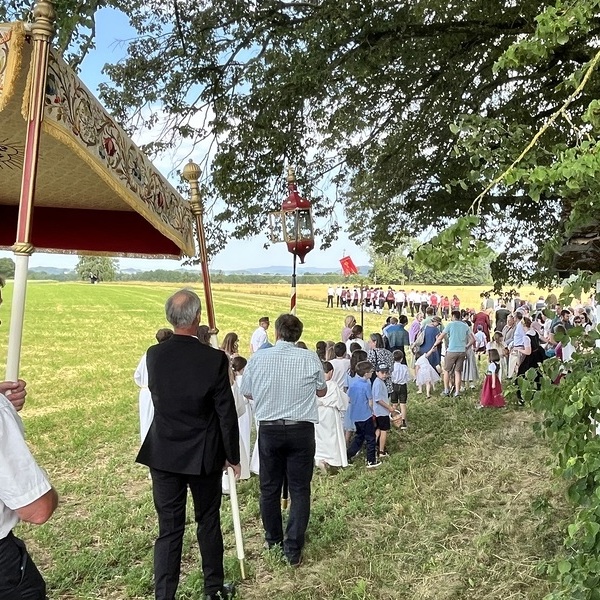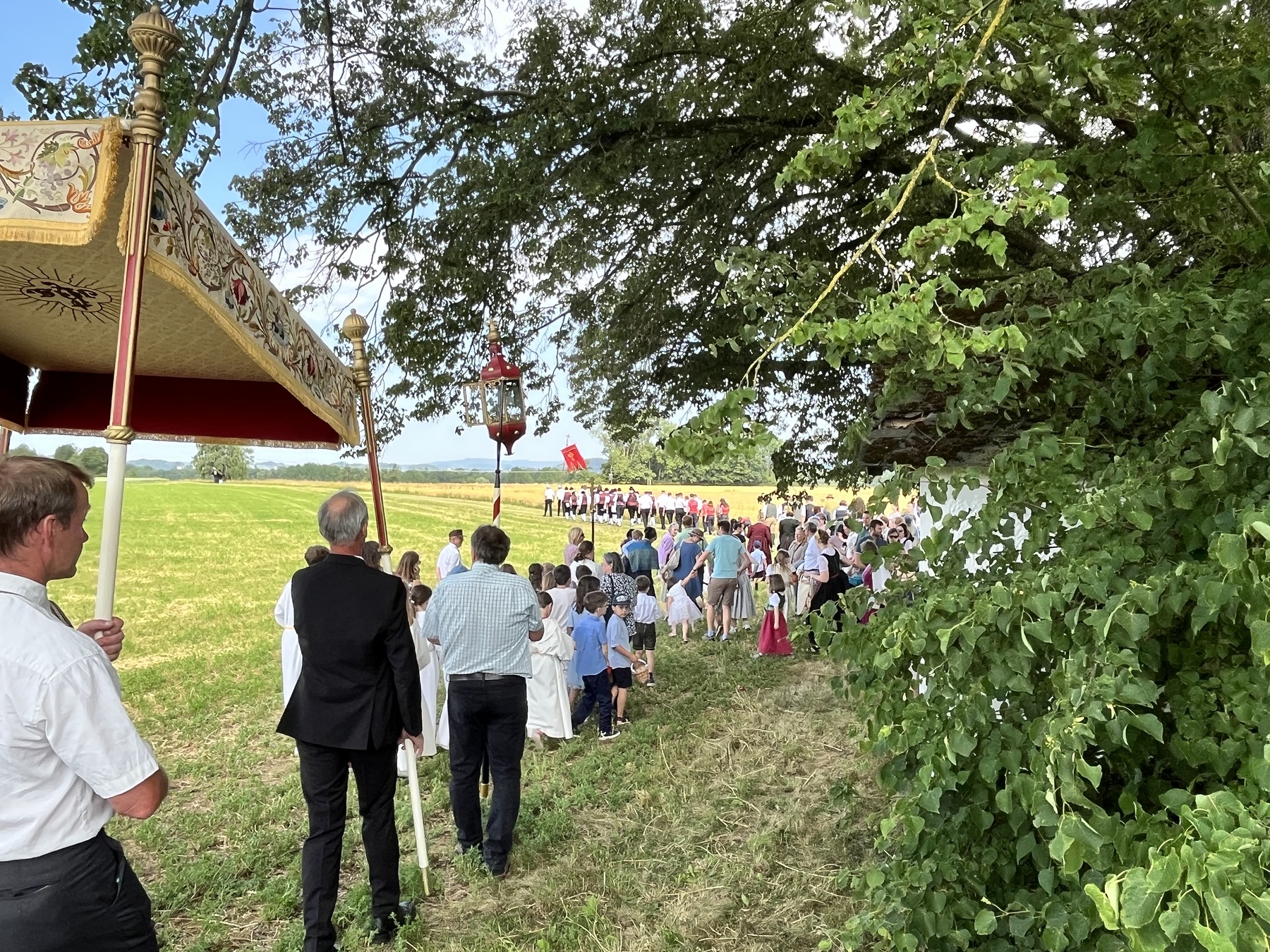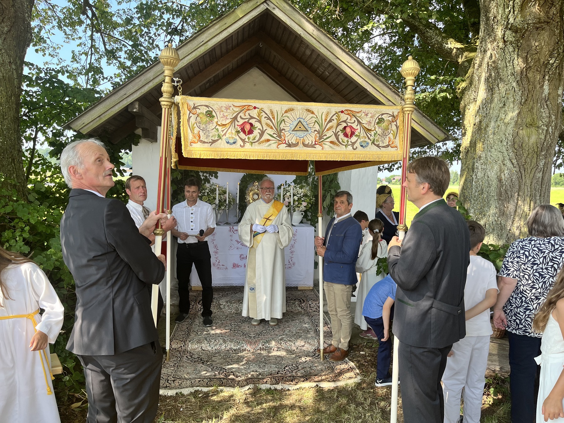 Bei strahlendem Sonnenschein feierte unsere Gemeinde heute das Fronleichnamsfest. Nach einem feierlichen Gottesdienst, den uns seit vielen Jahren unser Diakon Herbert Schiller, feierlich in der Kirche zelebriert, zog die Prozession mit vielen Gläubigen – Groß und Klein – durch blühende Wiesen und Felder. An drei sehr schön gestalteten Segensstationen wurde Halt gemacht, um den Segen Gottes in die Welt hinauszutragen. Die Kinder streuten Blumen auf den Weg und verliehen dem Fest ein besonders lebendiges und farbenfrohes Bild.