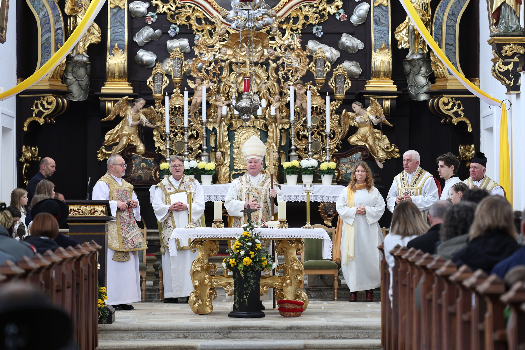 Naturfreunde Sandl, die Mitglieder der Legio Maria), der Pfarrgemeinderat, sowie die geladenen Ehrengäste samt der Pfarrbevölkerung und den Gästen aus Nah und Fern in einem eindrucksvollen Festzug in die Kirche ein. Dabei wurden die liturgischen Gegenstände und die Monstranz mit dem