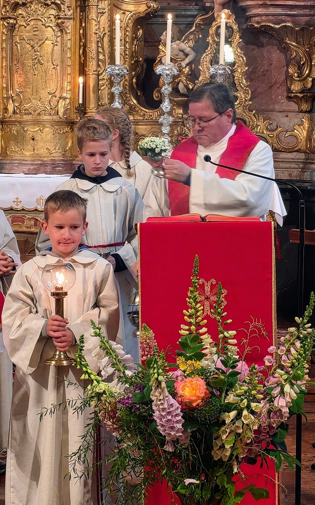 Die Kirche war festlich geschmückt – farbenfrohe Blumenarrangements mit vorwiegend Pfingstrosen unterstrichen die besondere Atmosphäre. Pfarrer Eduard Bachleitner betonte in seiner Predigt die Bedeutung von Pfingsten als Fest des Heiligen Geistes und des Neubeginns – ein Symbol auch für die vier jungen Ministranten, die sich neu in den Dienst stellen.