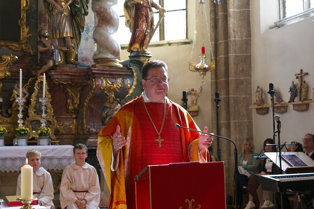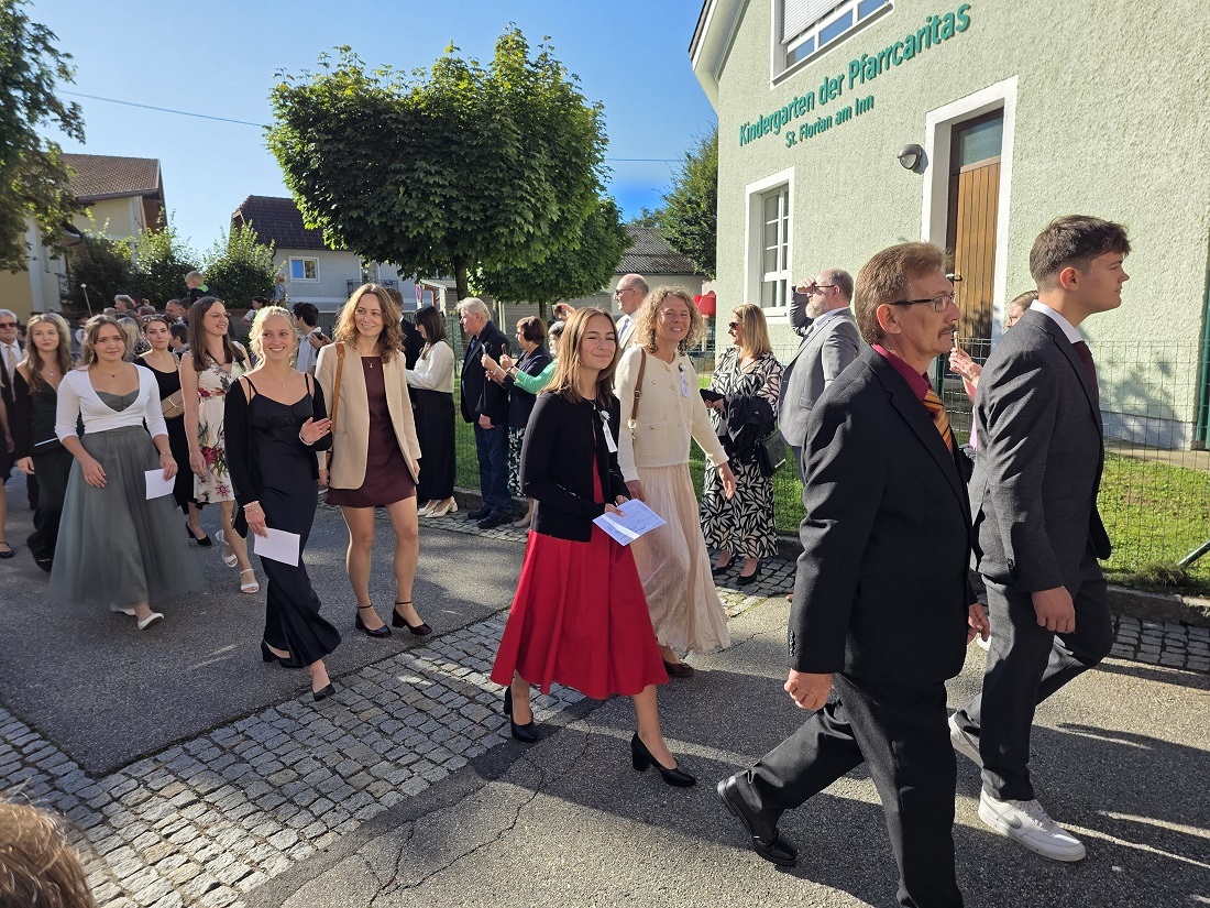 Die Feier fand bei herrlichem Wetter in der Pfarrkirche St. Florian statt und wurde von Abt Maximilian Neulinger aus dem Stift Lambach geleitet. Seine Predigt war geprägt von der Einladung, das eigene Leben aus dem Glauben zu gestalten, mutig nach vorne, aber auch auf einander zu schauen und Verantwortung in der Gemeinschaft zu übernehmen.