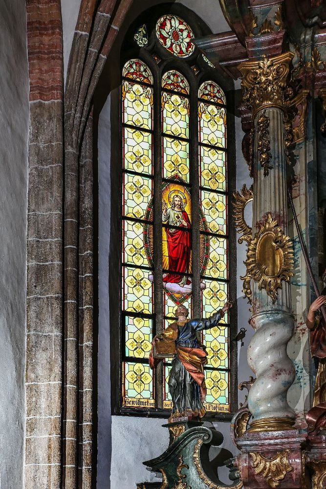Glasfenster aus dem Kriegsjahr 1914, zur Linken des Hochaltars: Herz Jesu (gewidmet von der Gemeinde)