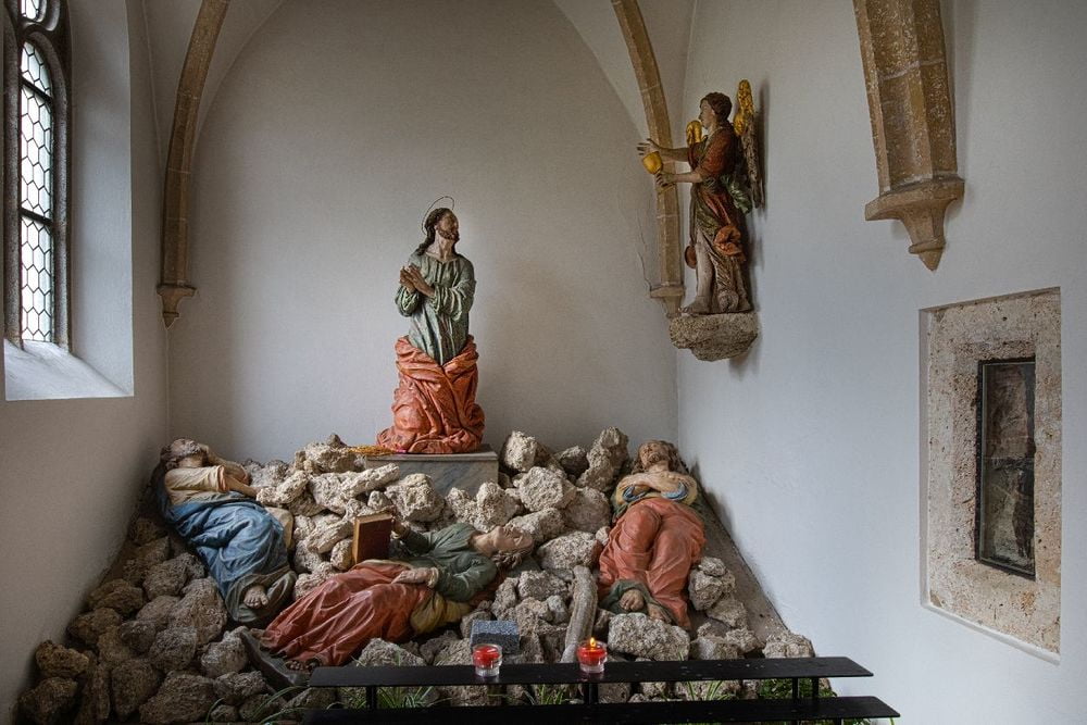 Ölberg in der 1908 angebauten Vorhalle zur Kirche: Figurengruppe (vor 1690) vermutlich aus der Werkstatt Johann M. Högenwald in Passau: Christus in Todesangst die Hände ringend, Engel mit Leidenskelch, die drei Lieblingsjünger