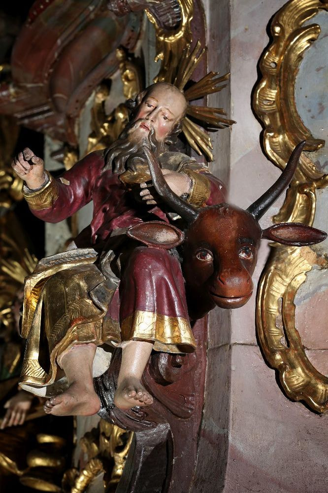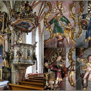 Am Kanzelkorb einer der vier Evangelisten: Matthäus (Attribut fehlt), Markus mit Löwen, Lukas mit Stier, Johannes mit Buch und Kelch;