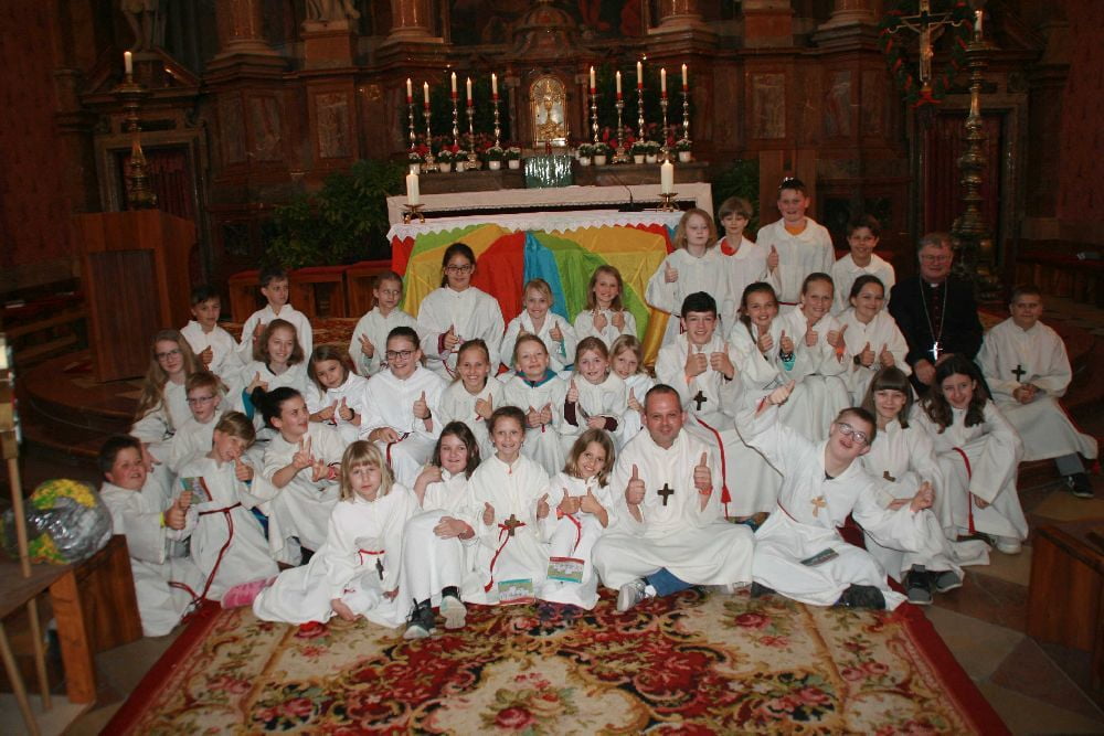 Doch zuvor zogen bei strahlendem und warmem Wetter die 1300 Minis in die Stiftskirche ein. Unglaublich, so ein Einzug dauert alleine schon 25 Minuten, dabei machten einige Gruppen mit dem Bischof am Eingang gleich noch ein Foto, da man sowieso warten musste bis man einen Platz zugewiesen bekam.