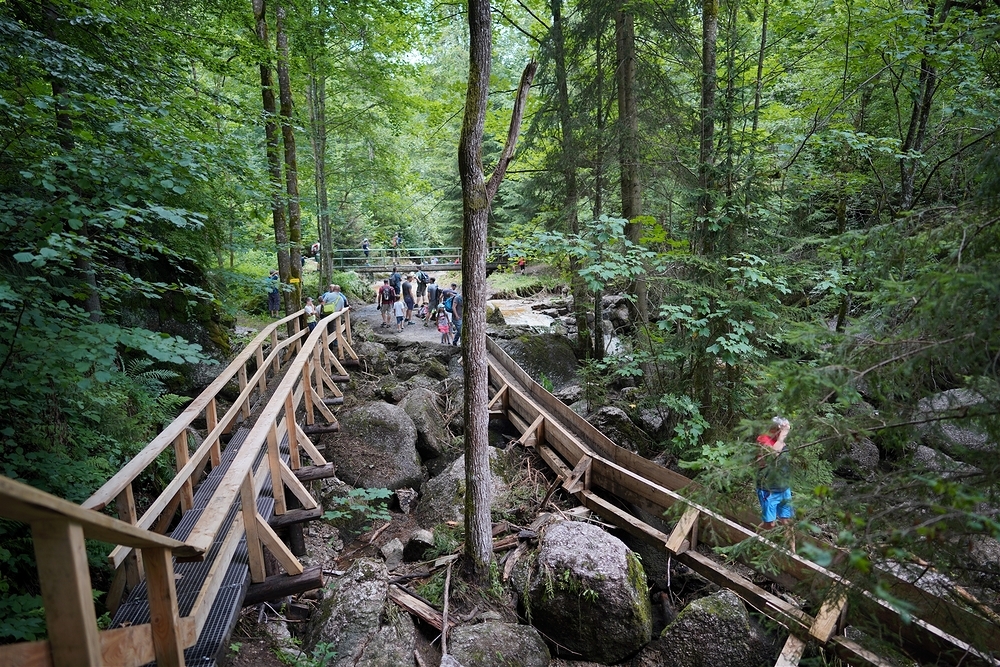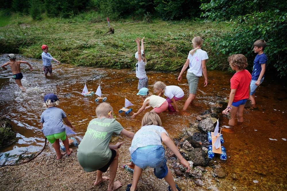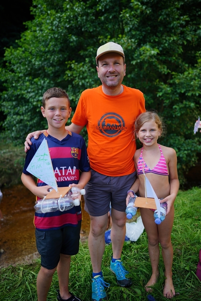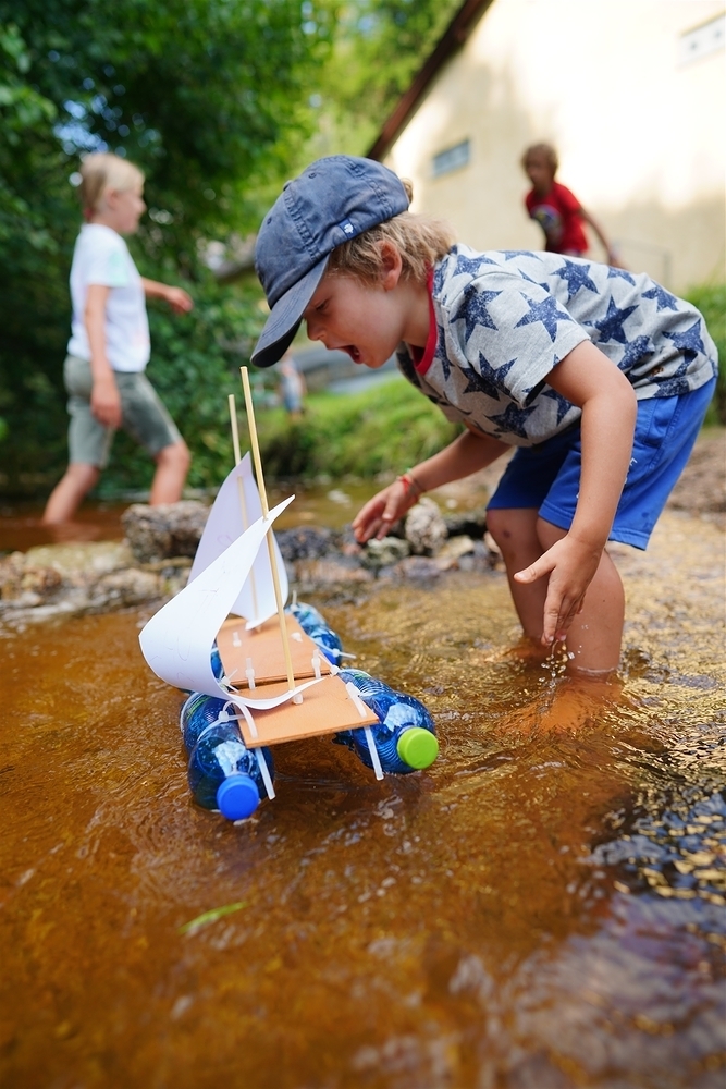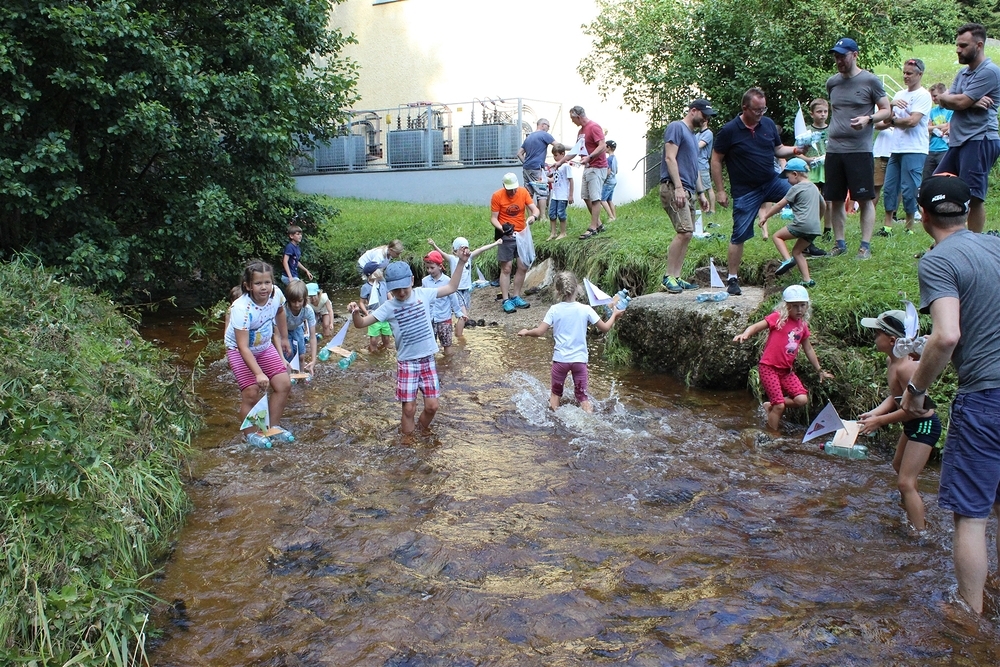 Das Karlingerhaus offeriert noch einen anderen, wichtigen Vorteil: Unser Paket beinhaltet ein Frühstück und zwei warme Mahlzeiten, welche vom Haus-Team immer sehr großzügig und mit sehr viel Liebe zubereitet werden. Das erleichtert uns Vätern den Ablauf des Wochenendes enorm, da wir nicht sämtlichen Proviant mitbringen müssen. Nach dem Essen dürfen wir die Zimmer beziehen und nützen danach das nachmittägliche Sonnenfenster für eine kurze Wanderung und eine Bootsregatta auf dem Kammleitenbach. Die Wanderung gestaltet sich trotz vorwöchiger Besichtigung als wesentlich abenteuerlicher als erwartet, da durch die starken Gewitter der vorausgegangenen Tage viele Bäume, Sträucher, Steine, Felsen, Sitzbänke und Brücken nicht mehr an den ursprünglichen Stellen zu finden sind. Die Natur zeigt uns eindrucksvoll, wie viel Kraft in ihr steckt. Über die Himmelsleiter gelangen wir zum Kanzelstein, welcher ob seiner Höhe nicht minder beeindruckend ist. Zurück am Ausgangspunkt bauen wir die Regattaboote zusammen, um diese dann in Form eines Massenstarts einige hundert Meter den Kammleitenbach hinab segeln zu lassen. Für die eine oder andere Bootsdame bzw. den Bootsherren ist die Regatta auch ein Mitlaufen durch den Bach, um sicher zu stellen, dass keines der Boote sich im Ufer-Gestrüpp verhakt oder durch zu hohen Wellengang kentert.