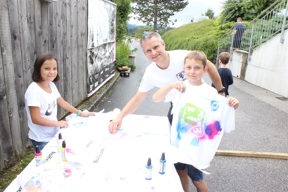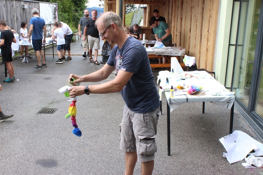 Nach dem Frühstück treffen wir uns in der Turnhalle zum schon beinahe zur lieben Gewohnheit gewordenen Morgenkreis. Wir hören die eine oder andere (auch zum Nachdenken anregende) Geschichte und freuen uns schon auf die von den Kindern immer wieder geforderte „Pizza-Massage“. Anschließend haben wir uns wieder entschlossen, etwas zu basteln, das die Kinder auch mit nachhause nehmen können und das sie über das Jahr an das Wochenende mit ihren Vätern erinnert. Mit Hilfe von Textilfarben und Schablonen gestalten wir bunte T-Shirts, was in manchen Kindern und Vätern durchaus den einen oder anderen Künstler weckt. Leider vertreibt uns auch hier der Wettergott etwas zu früh von den Basteltischen. Nach dem Mittagessen müssen manche bereits abreisen, viele bleiben noch bis etwa 14:30 und nutzen die Turnhalle zum Ballspielen und Klettern als auch den Pool zum Baden.