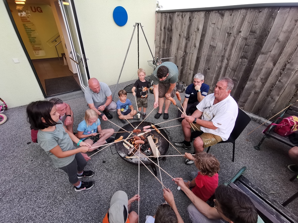 Mehreren erfolgreiche Wettfahren später kehren wir in unsere Unterkunft zurück und machen uns an die Vorbereitungen für das Abendessen. Neben einem Griller (für alle möglichen Köstlichkeiten) gibt es offenes Feuer für Knacker, Stockbrot und Marshmallows. Auch Schokobananen sind heuer dabei. Gegen 21 Uhr wollen wir noch eine Fackelwanderung wagen, aber da macht uns der Wettergott einen Strich durch die Rechnung und schickt uns das schon fast zur Routine gewordene Gewitter. Unser Abend endet mit Tischtennis und Fußball spielen, Baden im Hallenbad und gemütlichem Zusammensitzen.