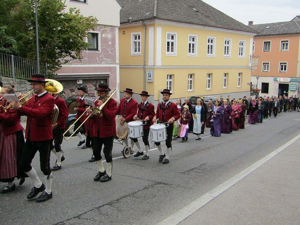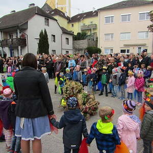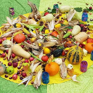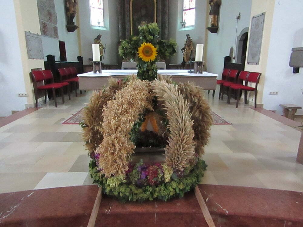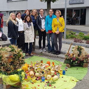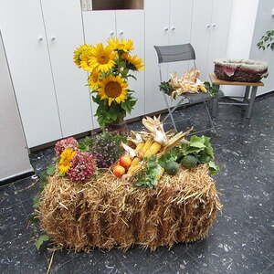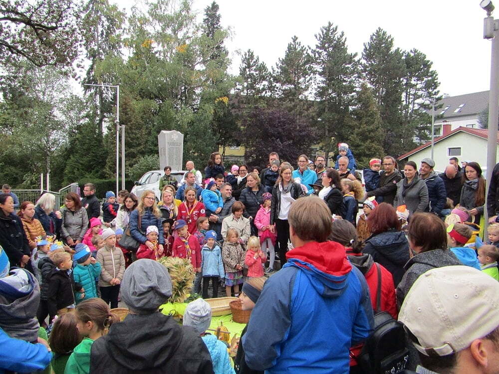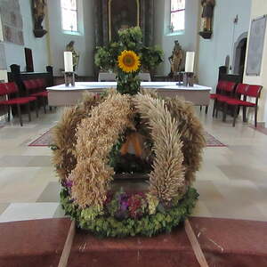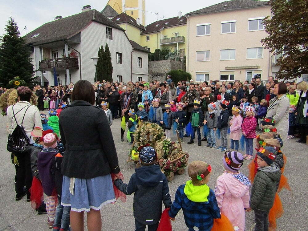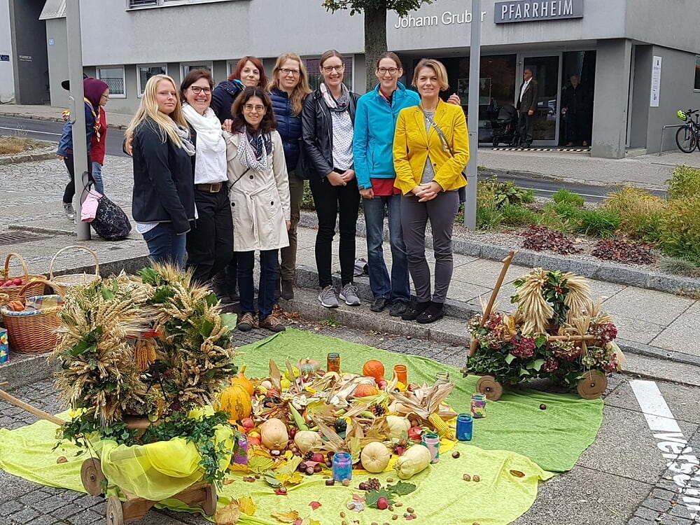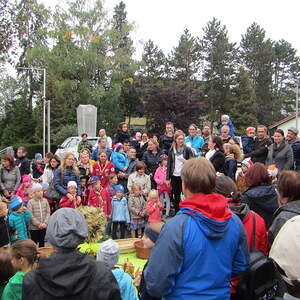 Nach der Segnung der Erntekrone zogen wir gemeinsam zur Kirche, wo mit der Eucharistiefeier fortgesetzt wurde, während für die Kinder in vier Stationen rund um die Kirche die Geschichte "Teilen macht Spaß" erzählt und gespielt wurde. Zum Abschluss gestalteten alle Kinder ein wunderschönes "Erntedank-Mandala" aus mitgebrachten "Ernteschätzen".