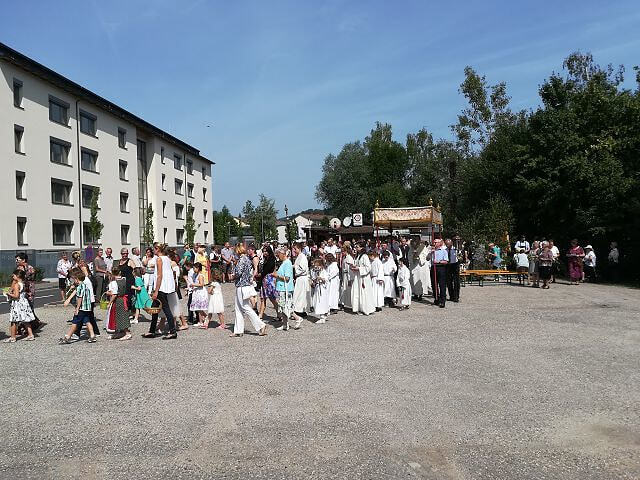 Unsere Gottesdienstgemeinschaft setzt sich fort, überall dort wo wir leben. Unser Ort und unsere Dörfer sind unser Lebensraum. Hier wohnen wir, viele von uns arbeiten hier, kaufen hier ein oder genießen die Stunden ihrer Freizeit. Hier begegnen wir anderen Menschen. Jesus Christus soll uns an jedem weltlichen Ort, in jedem Bereich unseres Lebens genauso nahe sein wie in der Kirche bei der Messe. Zum Zeichen dafür geht er mit uns im heiligen Brot.