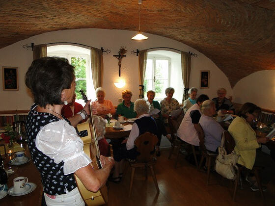 Bei Kuchen, Kaffee und Tee wird in geselliger Runde geplaudert, erzählt und gesungen.