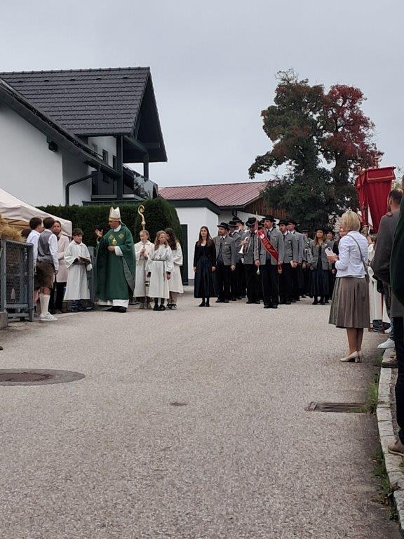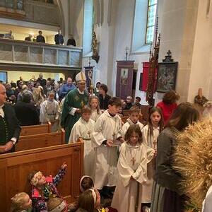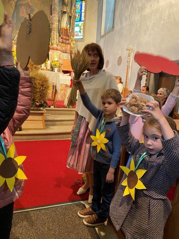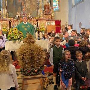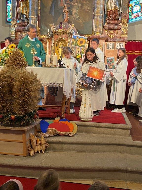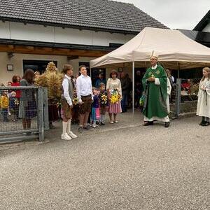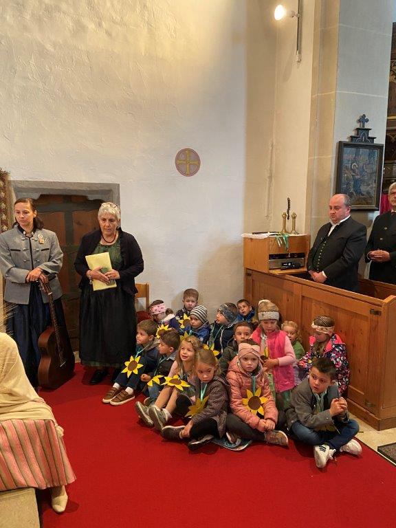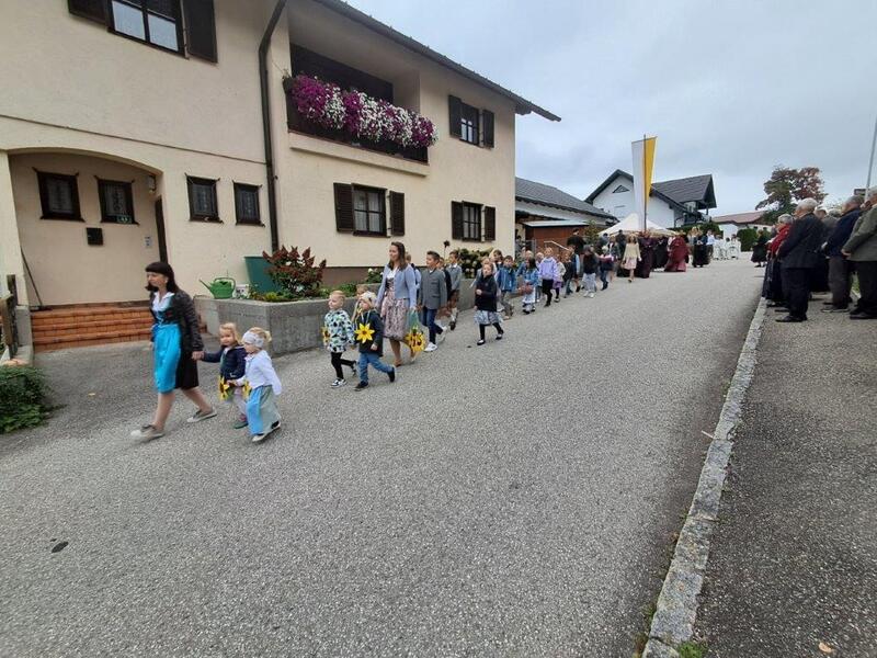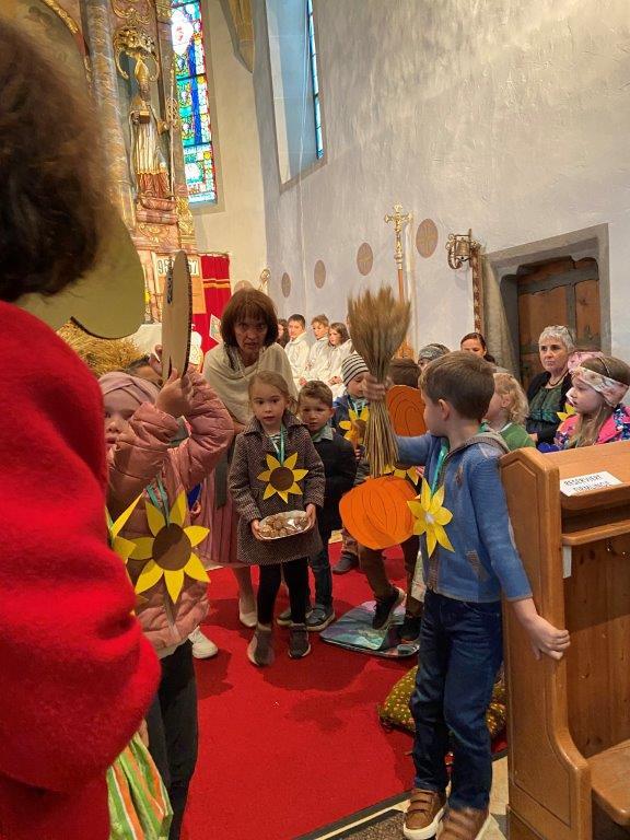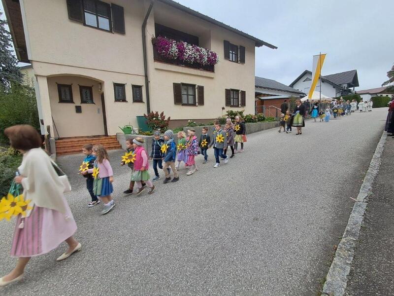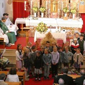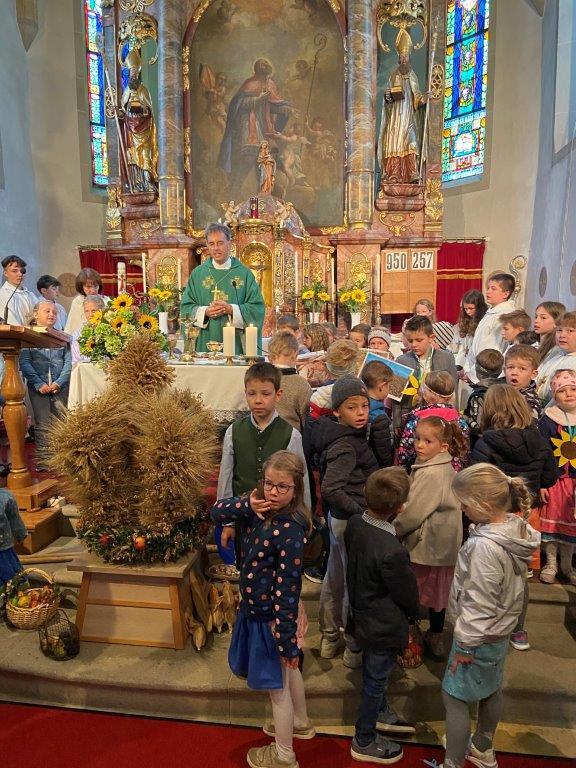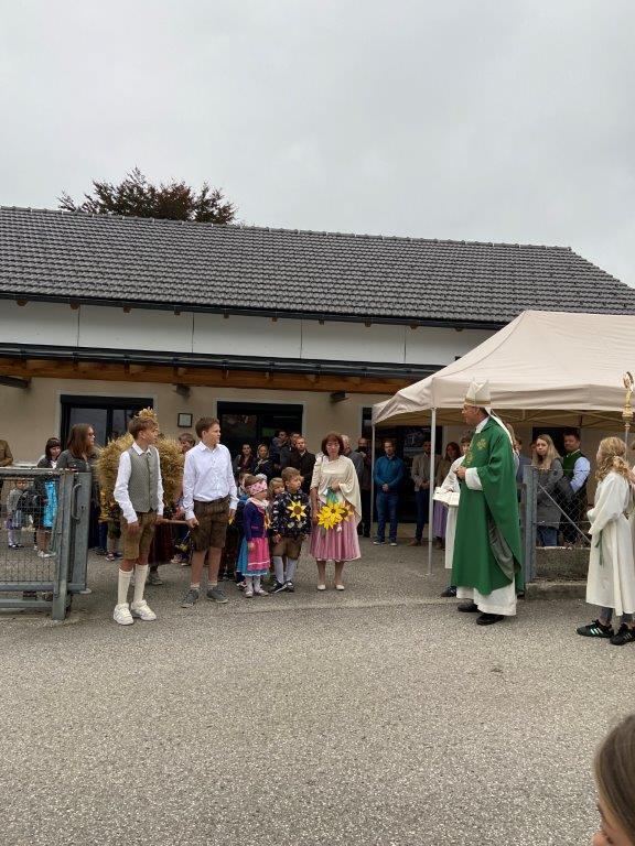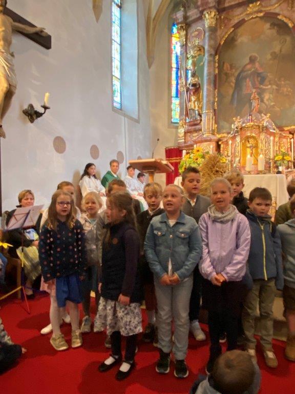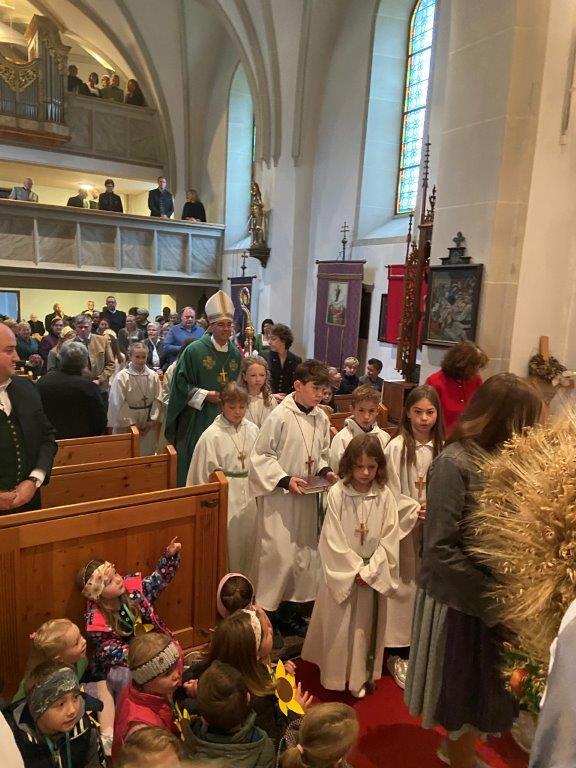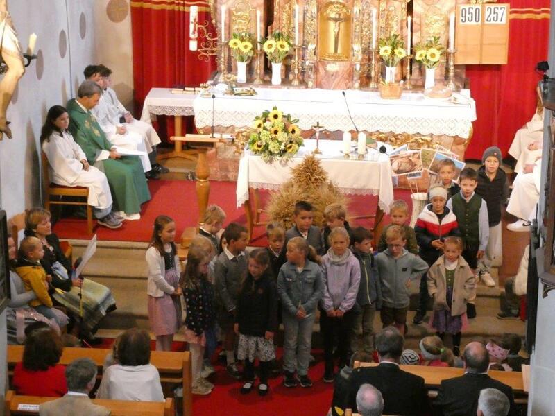 Mit der Musikkapelle St.Konrad zog die Schar von Kindergarten- und Schulkindern mit den Goldhauben, den Ministranten, den Firmlingen mit der Erntekrone sowie vielen Eltern und Großeltern in die Kirche ein, wo die Schar vom Kirchenchor begrüßt worden ist, der unterstützt von den Trompetern der Ortsmusik die Messe musikalisch begleitete.
