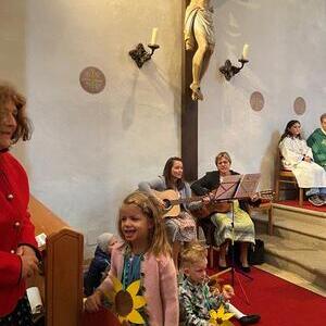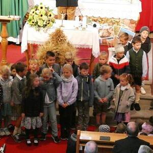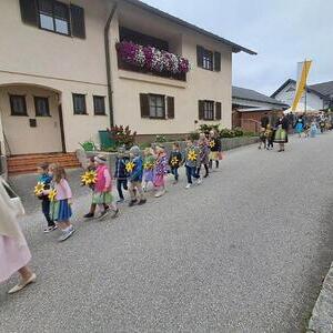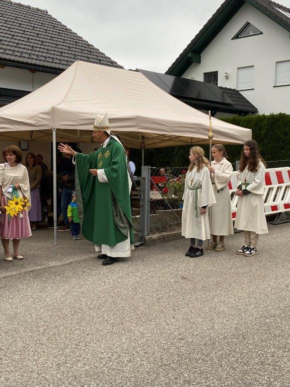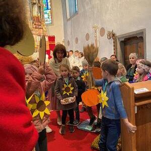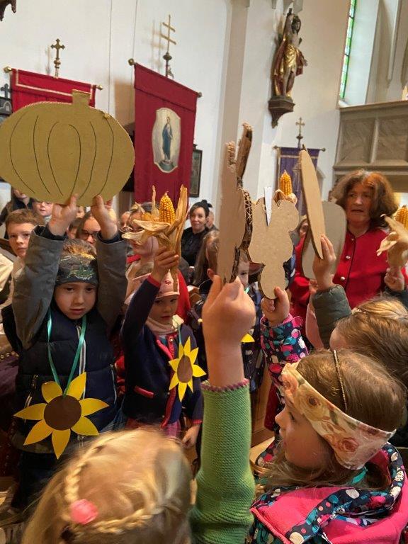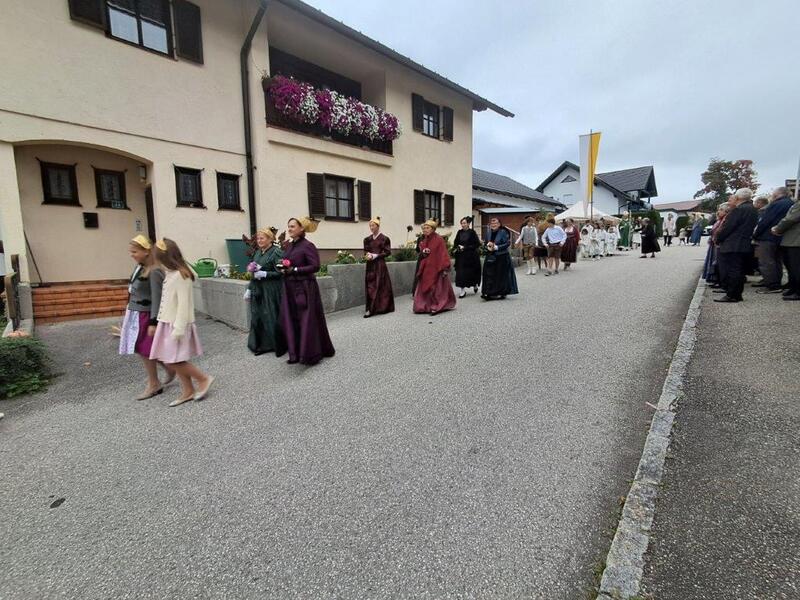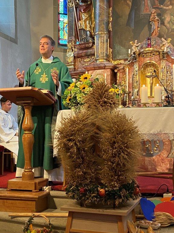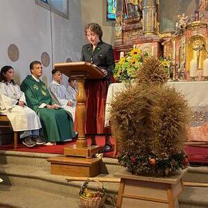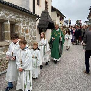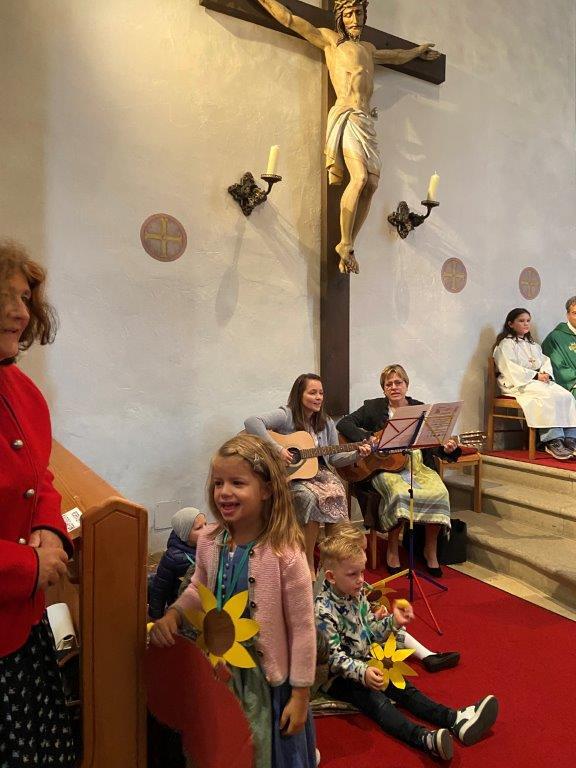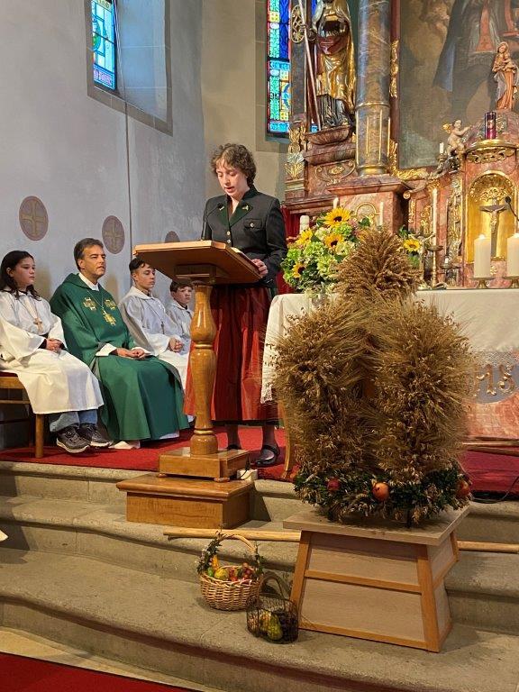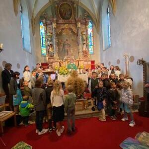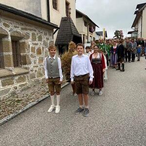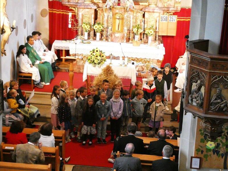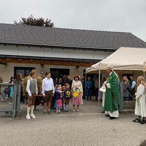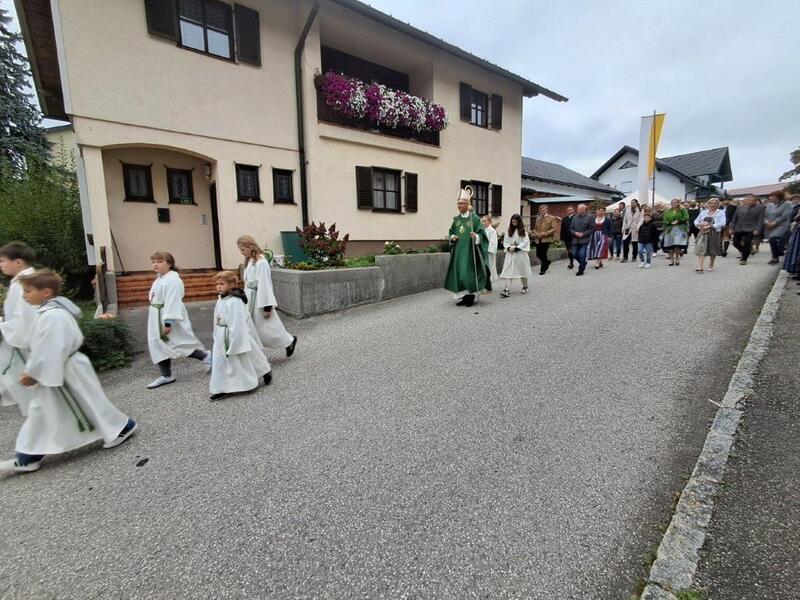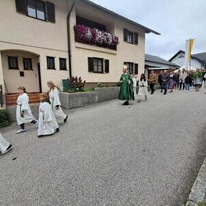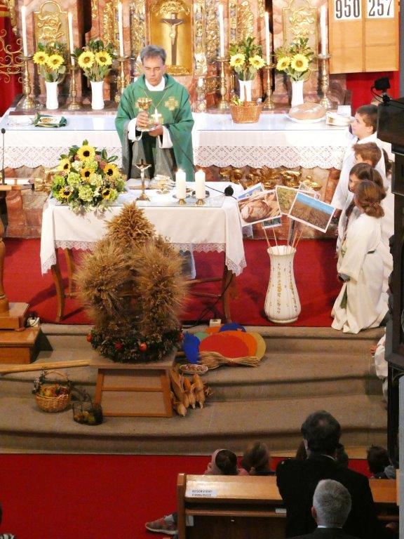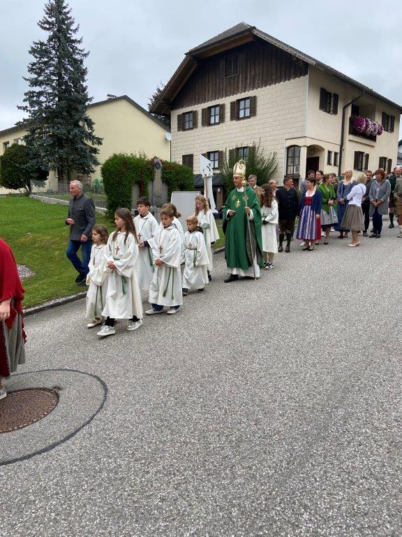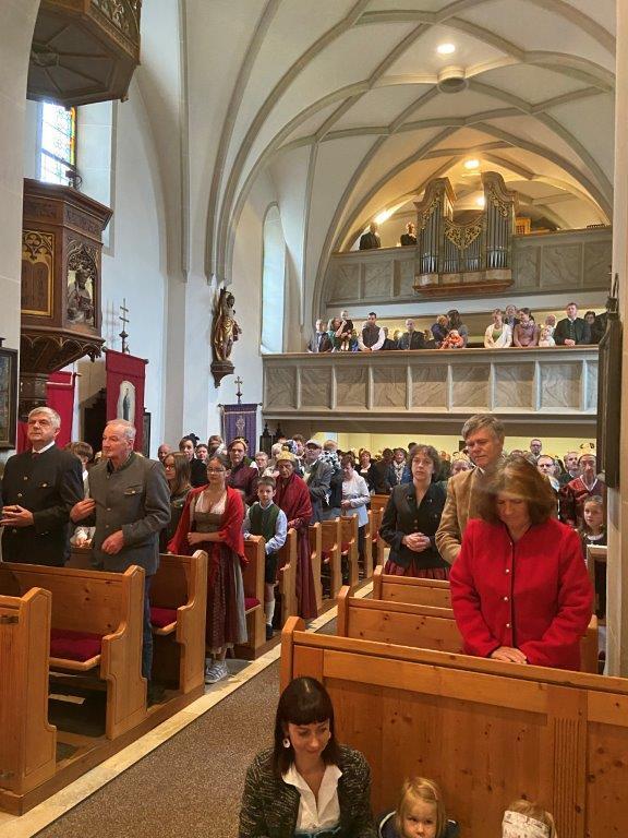 Mit der Musikkapelle St.Konrad zog die Schar von Kindergarten- und Schulkindern mit den Goldhauben, den Ministranten, den Firmlingen mit der Erntekrone sowie vielen Eltern und Großeltern in die Kirche ein, wo die Schar vom Kirchenchor begrüßt worden ist, der unterstützt von den Trompetern der Ortsmusik die Messe musikalisch begleitete.