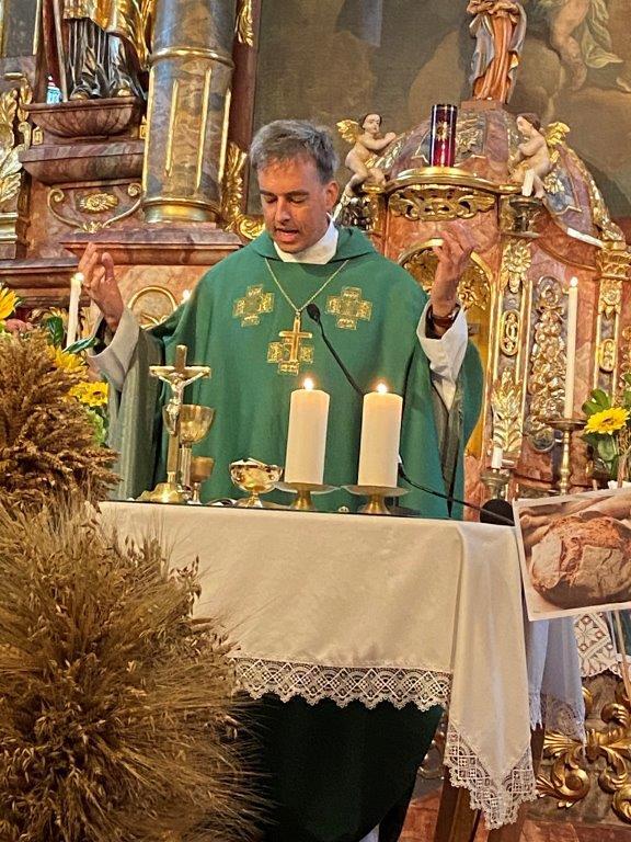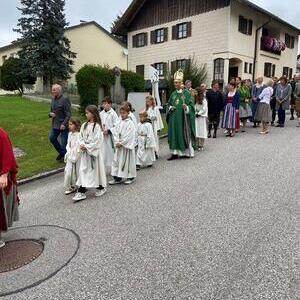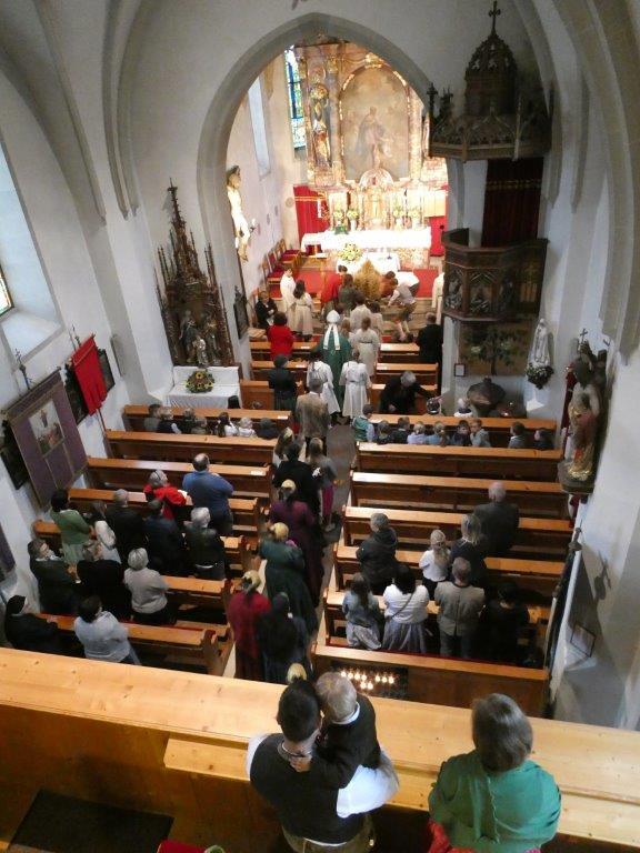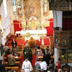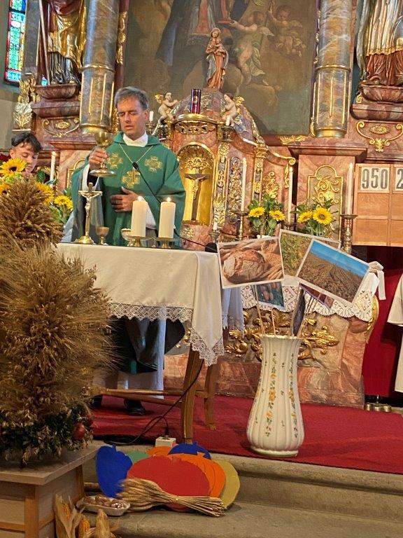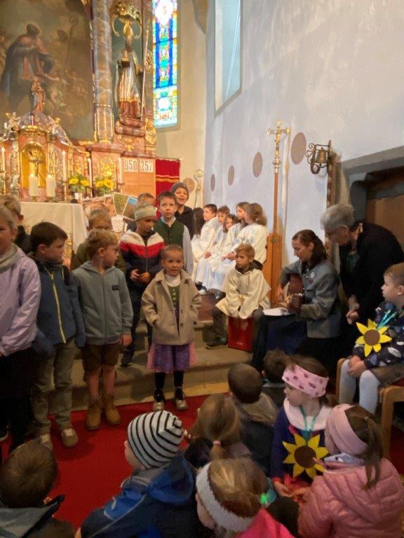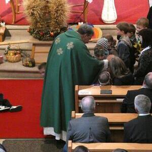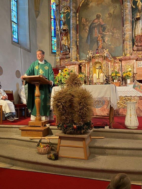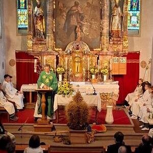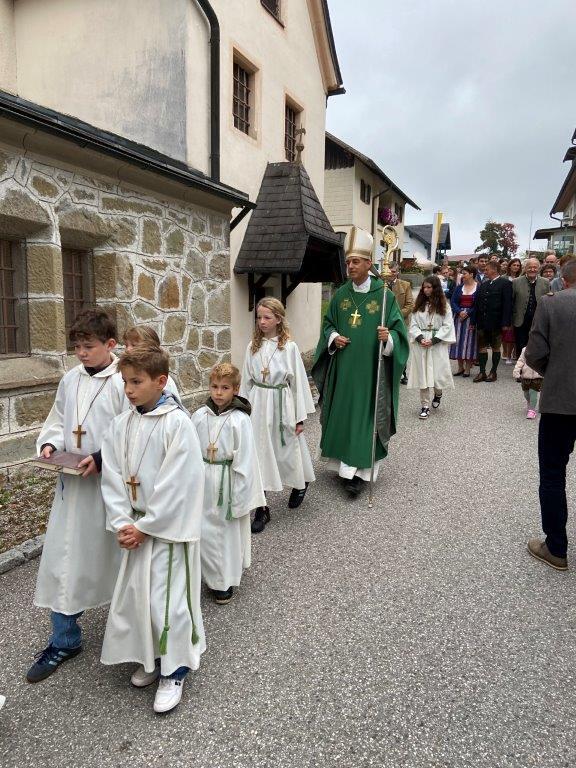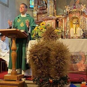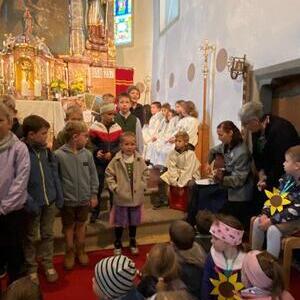 Die Kindergartenkinder sangen nach der Lesung ein frohes Herbstlied, das die Fülle der Früchte und Farben gut vor Augen stellte. Ausgehend vom Tagesevangelium über den armen Lazarus und dem reichen Prasser predigte Abt Bernhard über die Freude, die die Früchte des Glaubens bringen. Mit Hilfe seiner Amtsinsignien, der Mitra, seiner Kopfbedeckung, und dem Hirtenstab erläuterte er seine Aufgaben als Abt von Kremsmünster und seiner Verantwortung für die inkorporierten Pfarren. Die zahlreichen Ministranten beteten die Fürbitten und gestalteten die Gabenbereitung. Nach der Kommunion sangen die Schülerinnen und Schüler der Volksschule ein schönes Segenslied. Die zahlreichen Gläubigen und zahlreicheren Besucher waren angetan und erfreut über den lebendigen und abwechslungsreichen Gottesdienst sowie über die gewinnende und erfrischende Art des Kremsmünsterer Abtes, der alle herzlich einlud, auch die geistigen Angebote des Stiftes zu nutzen.