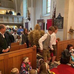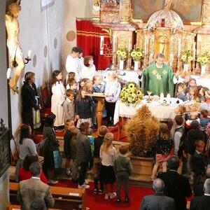 Mit der Musikkapelle St.Konrad zog die Schar von Kindergarten- und Schulkindern mit den Goldhauben, den Ministranten, den Firmlingen mit der Erntekrone sowie vielen Eltern und Großeltern in die Kirche ein, wo die Schar vom Kirchenchor begrüßt worden ist, der unterstützt von den Trompetern der Ortsmusik die Messe musikalisch begleitete.