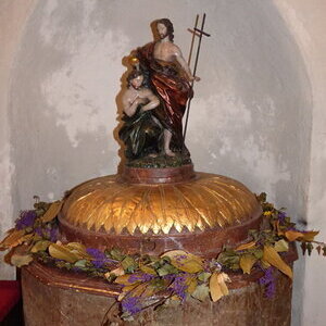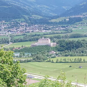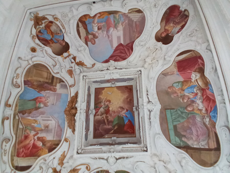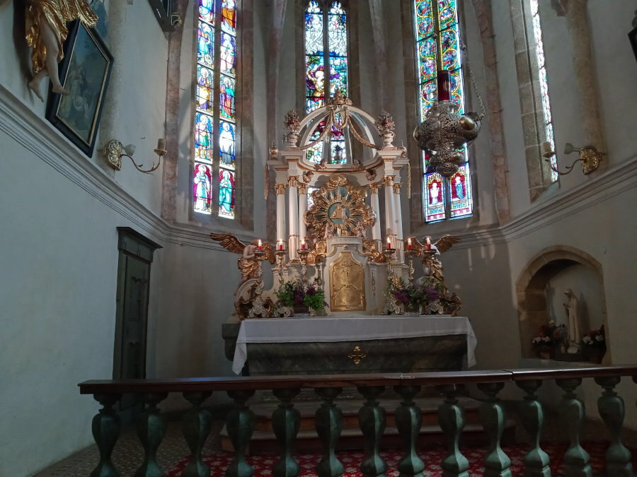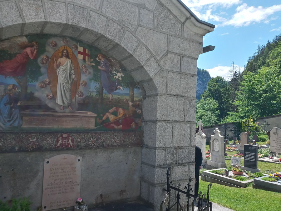 Das Mittagessen bereicherte der Wirt in Klachau mit der Erklärung seiner Schnapsbrennerei im Nebenzimmer des Gasthauses. Hier zeigte sich die Kompetenz einiger Wallfahrerinnen auch auf dem Gebiet des Schnapsbrennens. Bei immer besser werdenden Wetter brachen wir in das „Kripperl der Steiermark“, nach Pürgg auf. Weil die Einfahrt des Autobusses in den engen Ort untersagt ist, wurde ein Shuttle-Auto vom Kaffeehaus eingesetzt. Die Pfarrkirche Pürgg ist im Hang gelegen und erstreckt sich so über zwei Etagen. Hier feierten wir die Maiandacht. Im Anschluss labte sich ein Teil unserer Gruppe im Kaffeehaus Kern, die anderen gingen an den Ortsrand zur Johanneskapelle, in der sich gut erhalten Fresken aus dem 12. Jahrhundert befinden. Wegen des großen Andrangs auch anderer Interessierter konnte die Kapelle nur kurz besichtigt werden. Umso mehr genossen wir die schöne Aussicht auf das eindrucksvolle Massiv des ca 2300 m hohen Grimmings sowie einen Blick auf das Ennstal mit Schloss Trautenfels und Stainach-Irdning im Hintergrund.